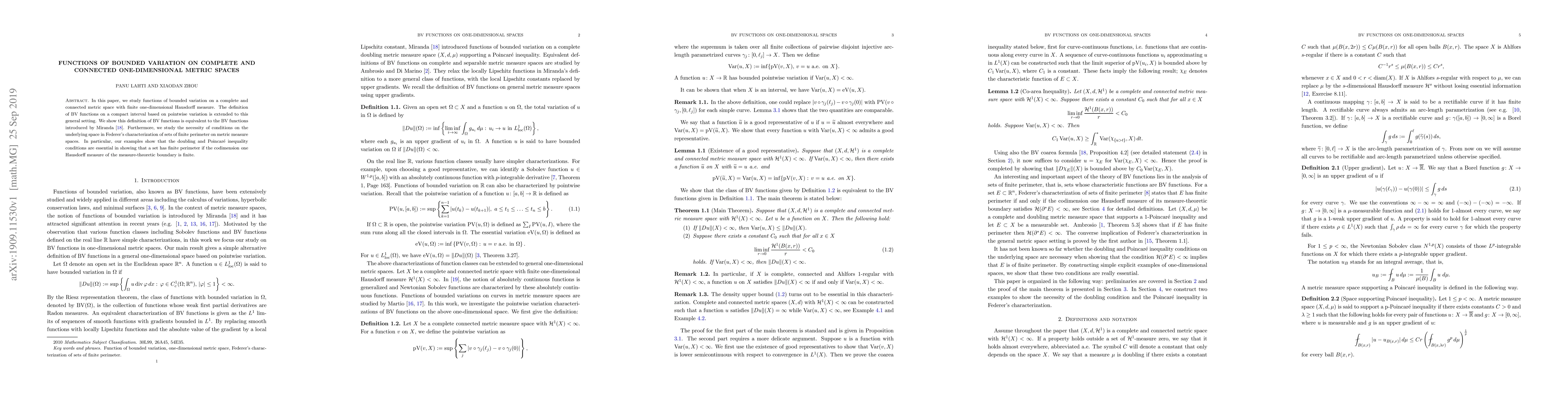 This paper extends the concept of functions of bounded variation from compact intervals to complete, connected one-dimensional metric spaces with finite Hausdorff measure. It demonstrates the equivalence of this new definition to Miranda's BV functions and highlights the necessity of doubling and Poincaré inequalities for Federer's characterization of sets of finite perimeter.
