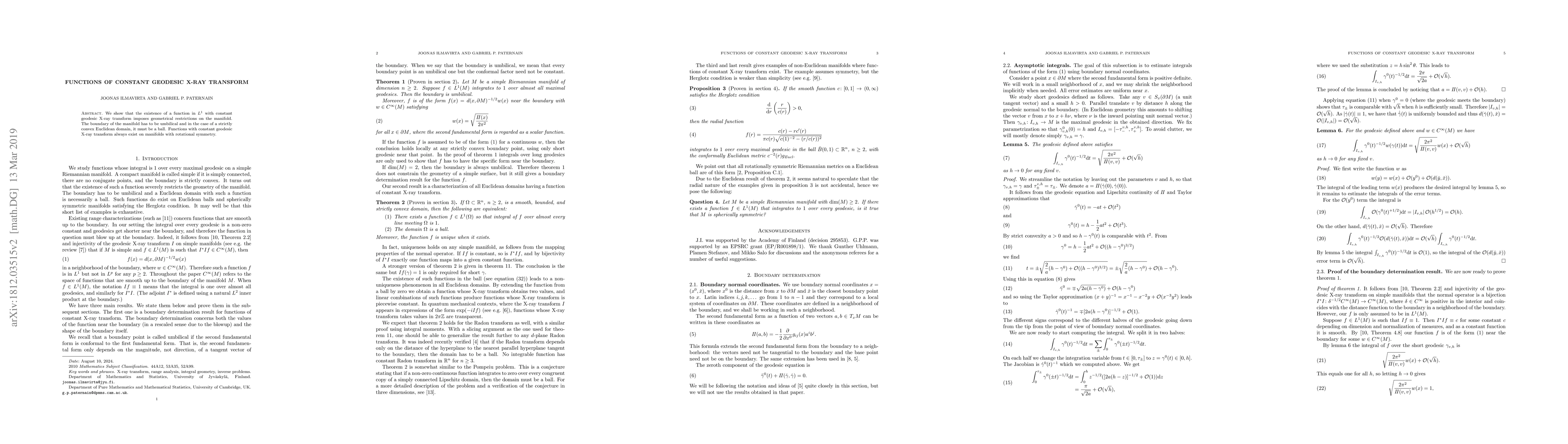This paper demonstrates that the existence of an $L^{1}$ function with a constant geodesic X-ray transform necessitates that the manifold's boundary is umbilical, and for strictly convex Euclidean domains, it must be a ball. It also confirms the presence of such functions on manifolds with rotational symmetry.