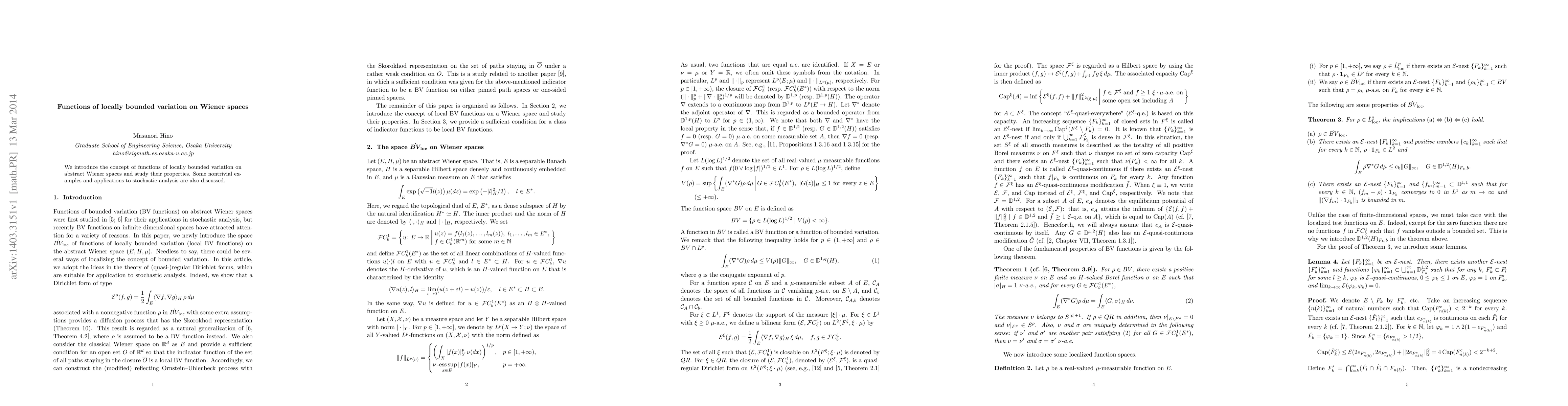 This paper introduces functions of locally bounded variation on abstract Wiener spaces and explores their properties, providing examples and applications relevant to stochastic analysis. The study aims to extend classical concepts to more complex stochastic environments.