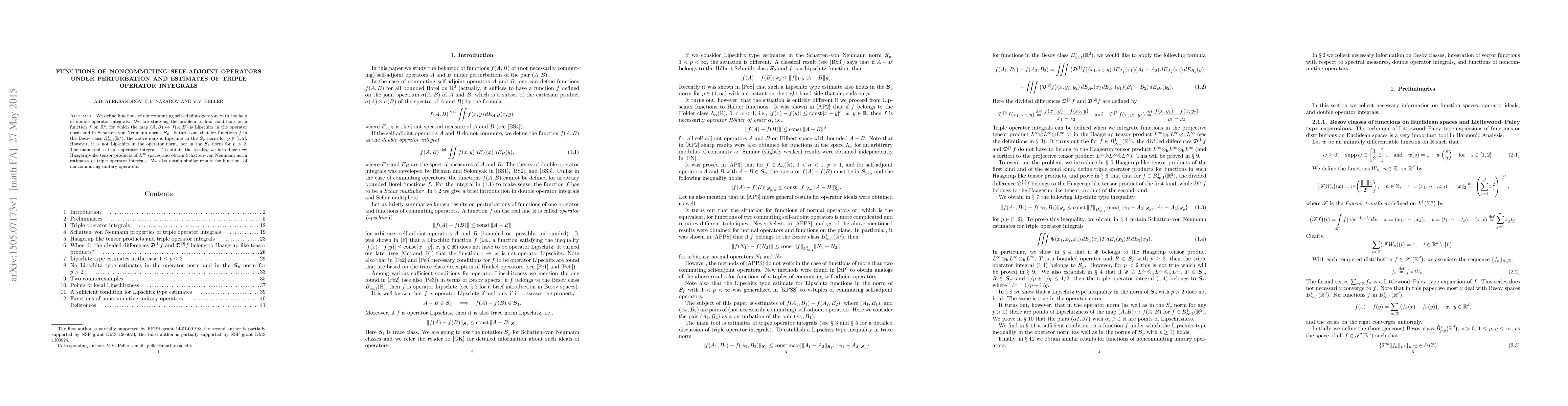 This paper studies functions of noncommuting self-adjoint operators using double operator integrals and triple operator integrals. It establishes Lipschitz conditions for maps from operators to functions in the Besov class, showing Lipschitz continuity in Schatten-von Neumann norms for $p\in[1,2]$ but not for $p>2$.