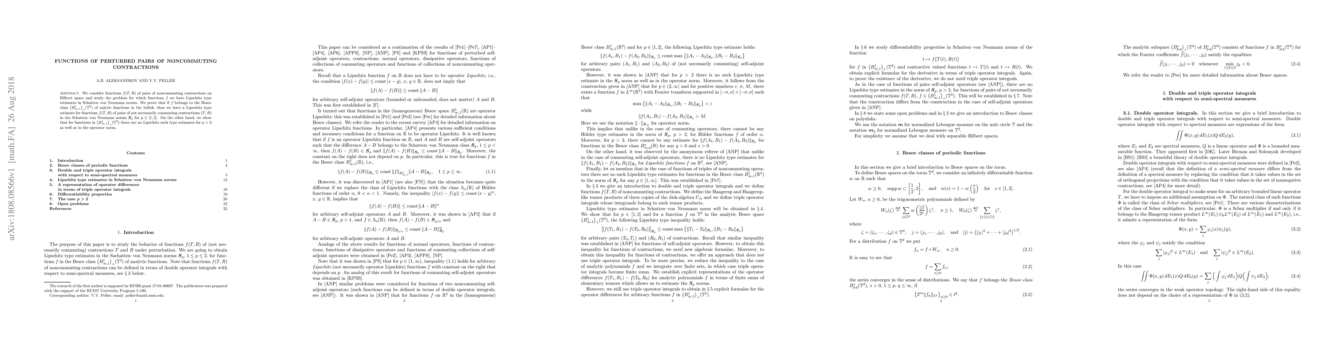 This paper investigates functions of pairs of noncommuting contractions on Hilbert space, proving Lipschitz type estimates in Schatten-von Neumann norms for functions belonging to the Besov class $(B_{\infty,1}^1)_+({\Bbb D}^2)$ for $p \in [1,2]$. It also demonstrates the absence of such estimates for $p > 2$ and in the operator norm.