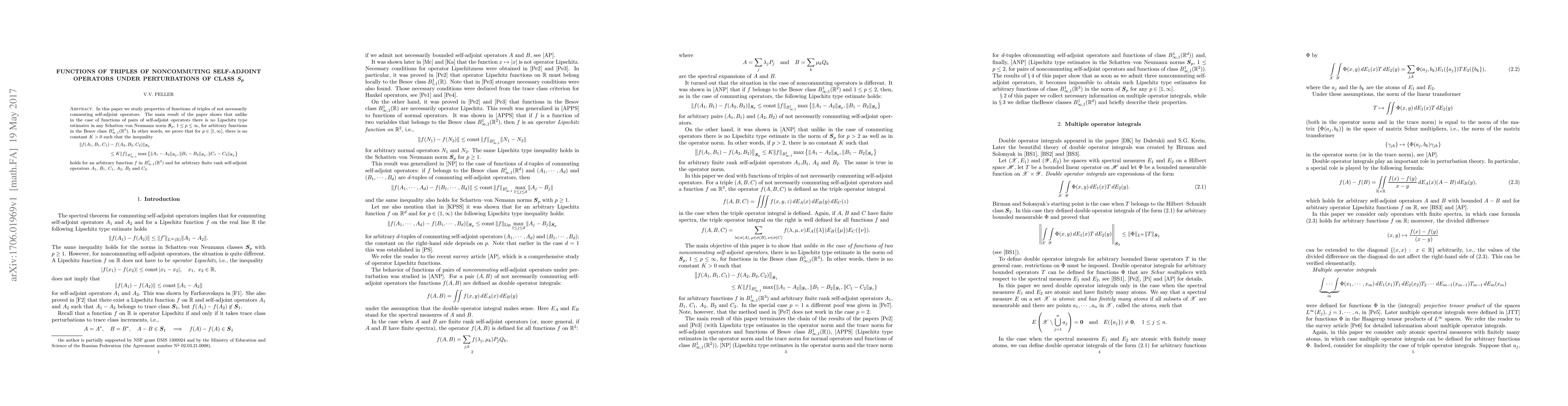 This paper investigates functions of triples of noncommuting self-adjoint operators under perturbations of class $\boldsymbol S_p$. It demonstrates that unlike pairs, no Lipschitz-type estimates exist for functions in the Besov class $B_{\infty,1}^1({\Bbb R}^3)$ in any Schatten-von Neumann norm $\boldsymbol S_p$, $1\le p\le\infty$.