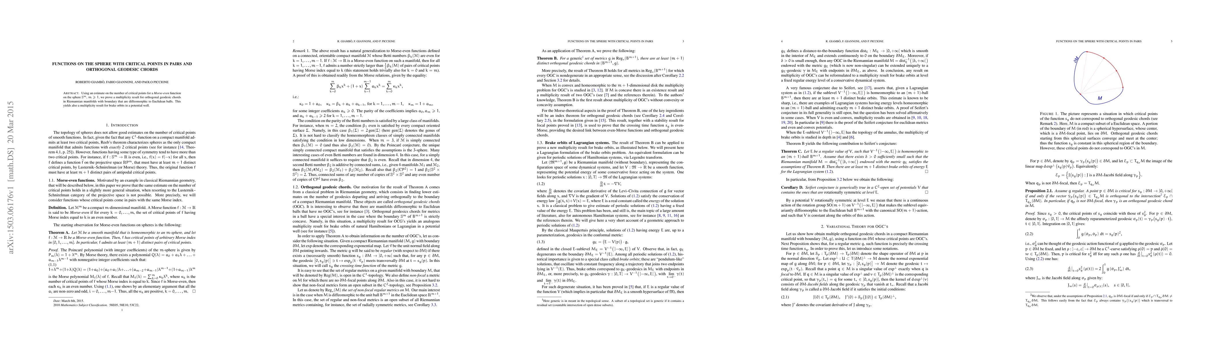 This paper establishes a multiplicity result for orthogonal geodesic chords in Riemannian manifolds with boundary, using an estimate on the number of critical points for a Morse-even function on the sphere. It also extends this result to the study of brake orbits in a potential well.