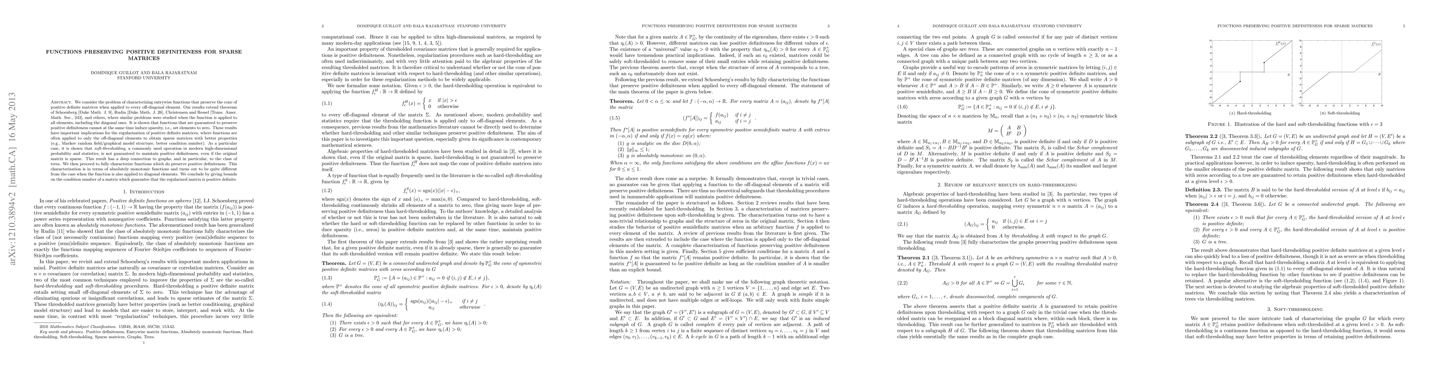 This paper characterizes entrywise functions that preserve the cone of positive definite matrices when applied to off-diagonal elements only, showing that such functions cannot induce sparsity. It concludes that soft-thresholding does not maintain positive definiteness and provides a complete characterization of preserving functions in terms of absolutely monotonic functions.