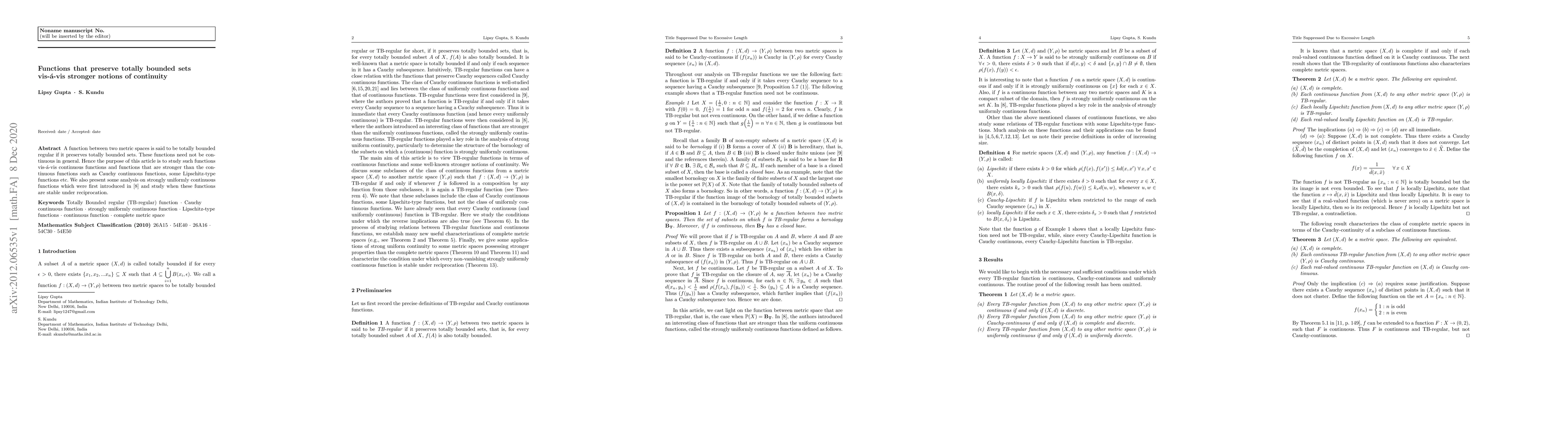 The paper analyzes functions between metric spaces that preserve totally bounded sets (TB-regular functions) in relation to stronger notions of continuity, including Cauchy continuity, Lipschitz-type functions, and strong uniform continuity.