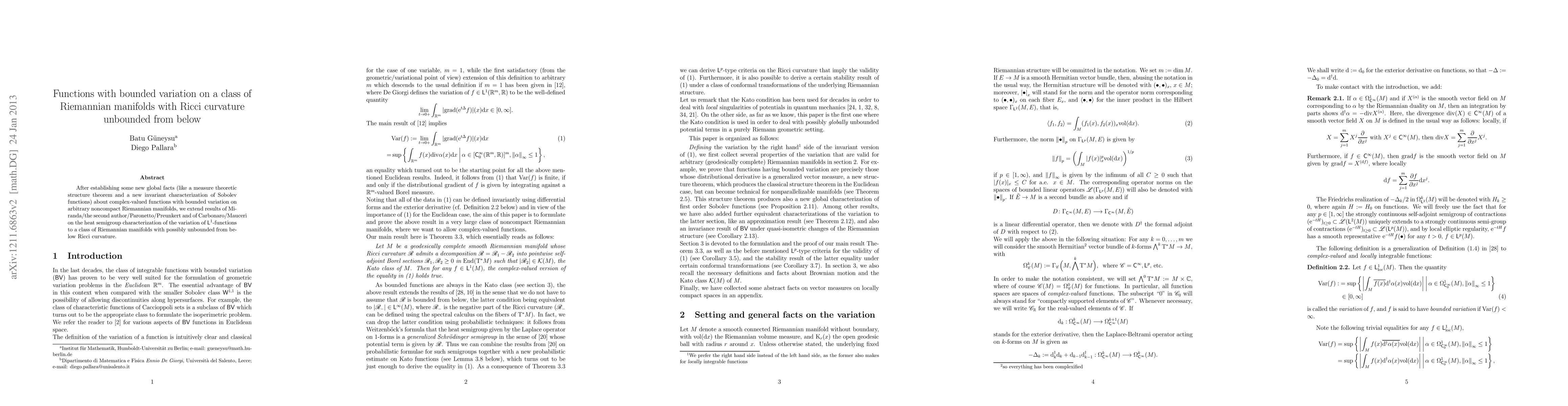This paper establishes new global properties for complex-valued functions with bounded variation on noncompact Riemannian manifolds, extending previous results on the heat semigroup characterization of L^1-functions to manifolds with Ricci curvature unbounded from below.