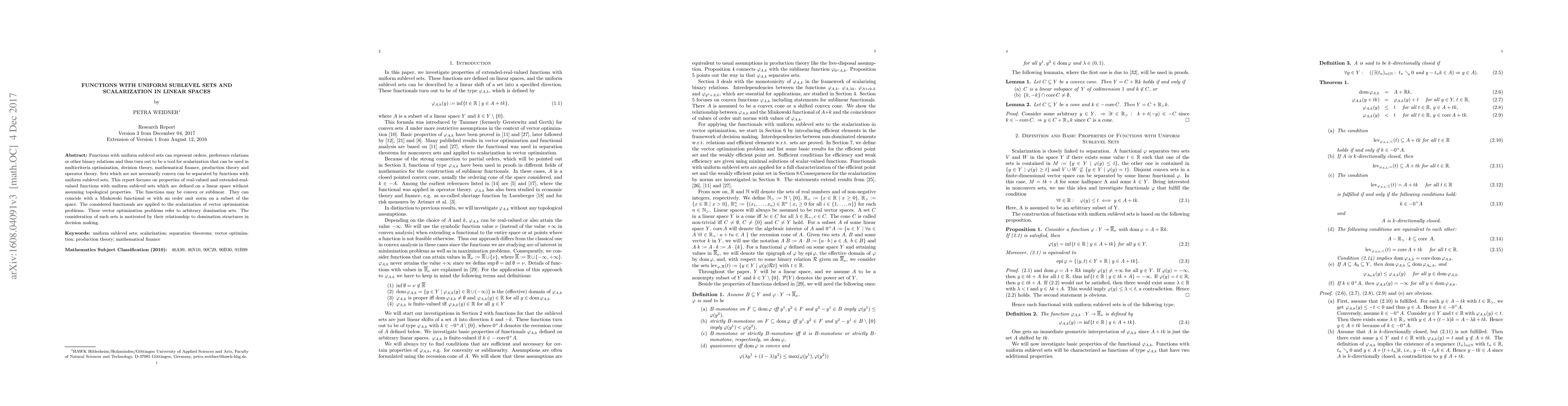 This paper explores real-valued and extended-real-valued functions with uniform sublevel sets defined on linear spaces, focusing on their properties and applications in scalarization for multicriteria optimization. It discusses how these functions can represent orders and preference relations, and their use in separating non-convex sets, particularly in vector optimization problems.