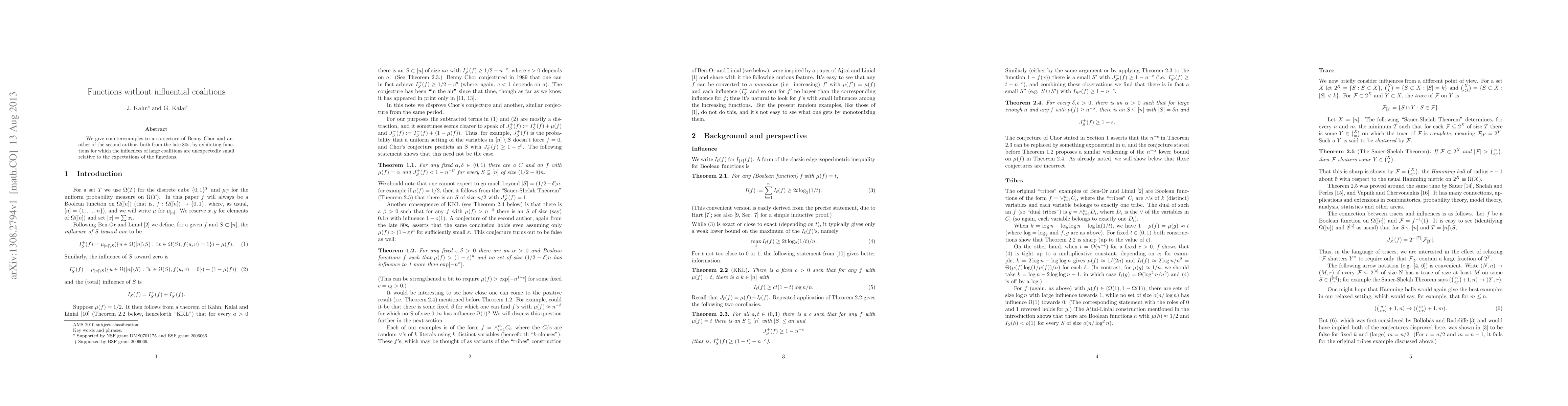 We give counterexamples to a conjecture of Benny Chor and another of the second author, both from the late 80s, by exhibiting functions for which the influences of large coalitions are unexpectedly small relative to the expectations of the functions.