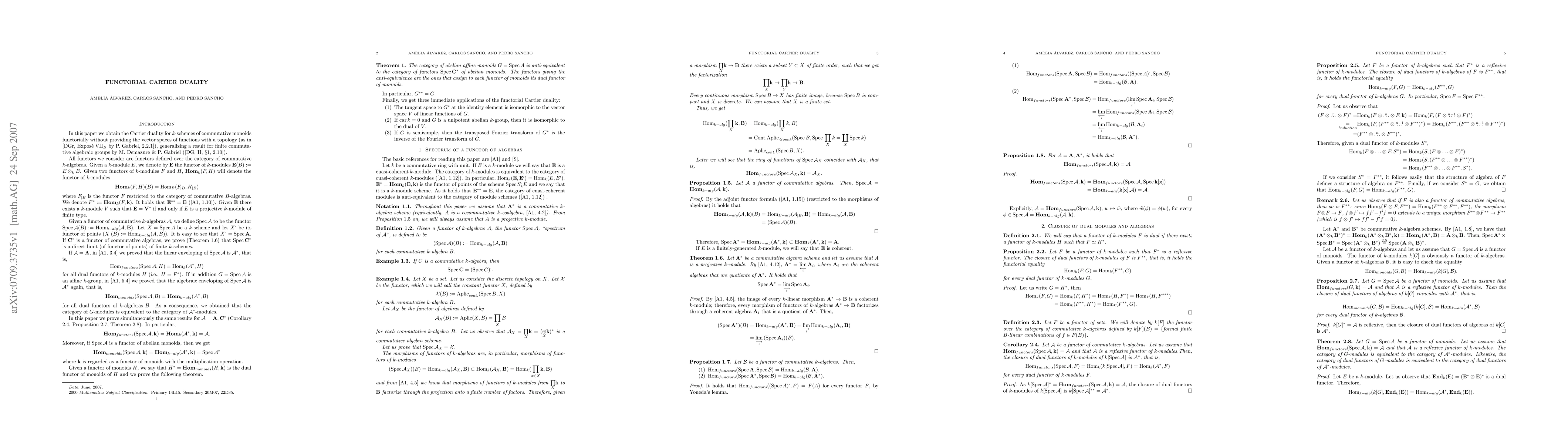 Summary: The paper establishes functorial Cartier duality for k-schemes of commutative monoids, extending Demazure and Gabriel's result for finite commutative algebraic groups without relying on topological vector spaces.