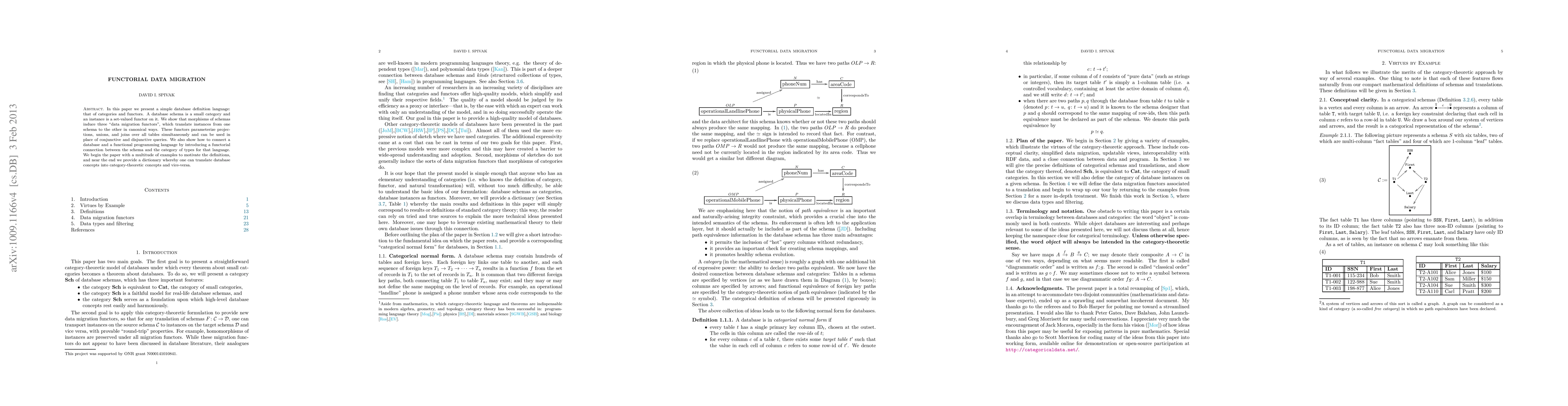 This paper introduces a database definition language based on category theory, where schemas and instances are represented as categories and functors, respectively. It proposes functors for data migration that handle projections, unions, and joins, and establishes a connection between databases and functional programming languages.