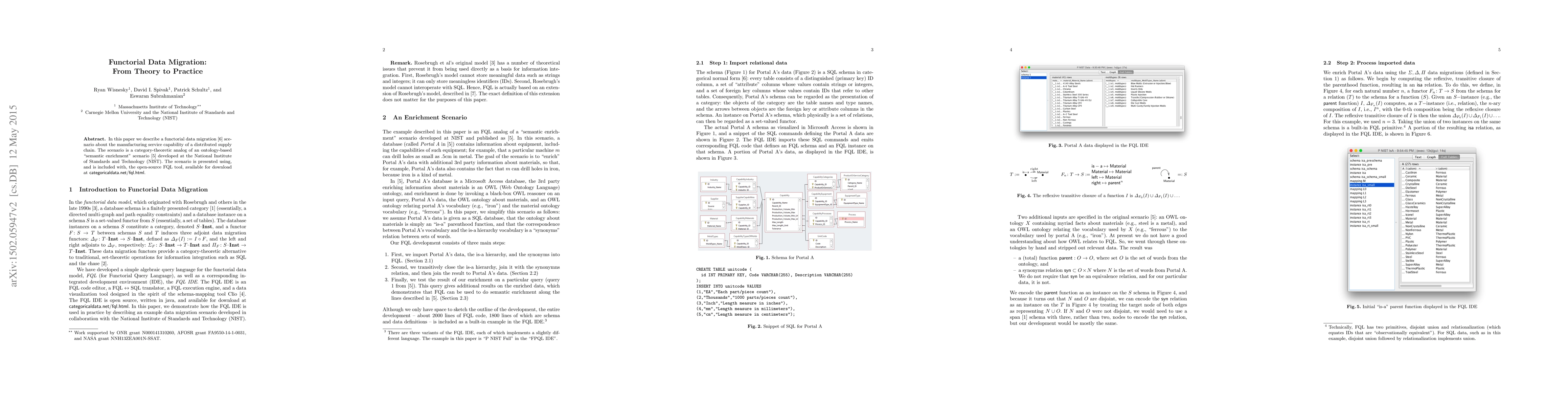 In this paper we describe a functorial data migration scenario about the manufacturing service capability of a distributed supply chain. The scenario is a category-theoretic analog of an OWL ontology-based semantic enrichment scenario developed at the National Institute of Standards and Technology (NIST). The scenario is presented using, and is included with, the open-source FQL tool, available for download at categoricaldata.net/fql.html.