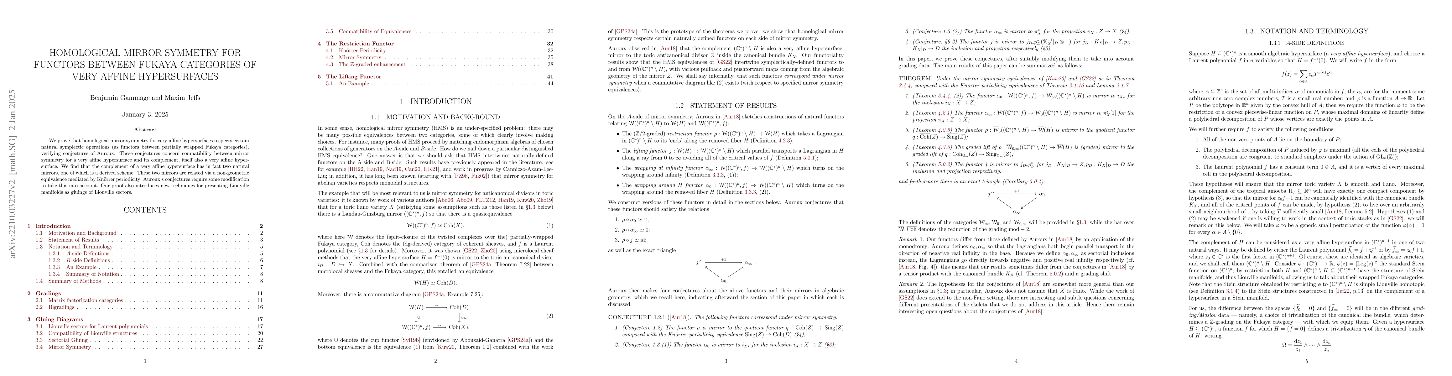 The paper proves Auroux's conjectures on homological mirror symmetry for very affine hypersurfaces, demonstrating compatibility between the hypersurface and its complement via functors. It identifies two natural mirrors for the complement, revealing a non-geometric equivalence via Knörrer periodicity.