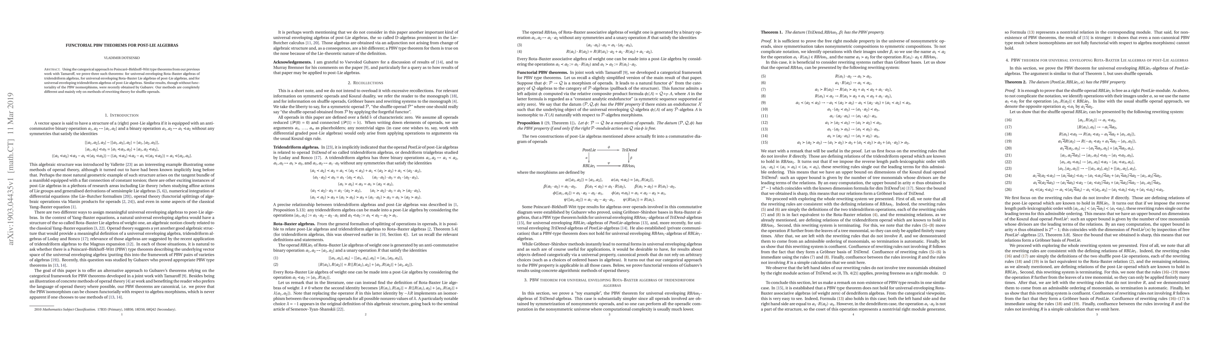 This paper proves three functorial PBW theorems for post-Lie algebras using a categorical approach, focusing on the universal enveloping Rota-Baxter algebras and their connections to tridendriform algebras. The methods differ significantly from previous results by employing rewriting theory for shuffle operads.