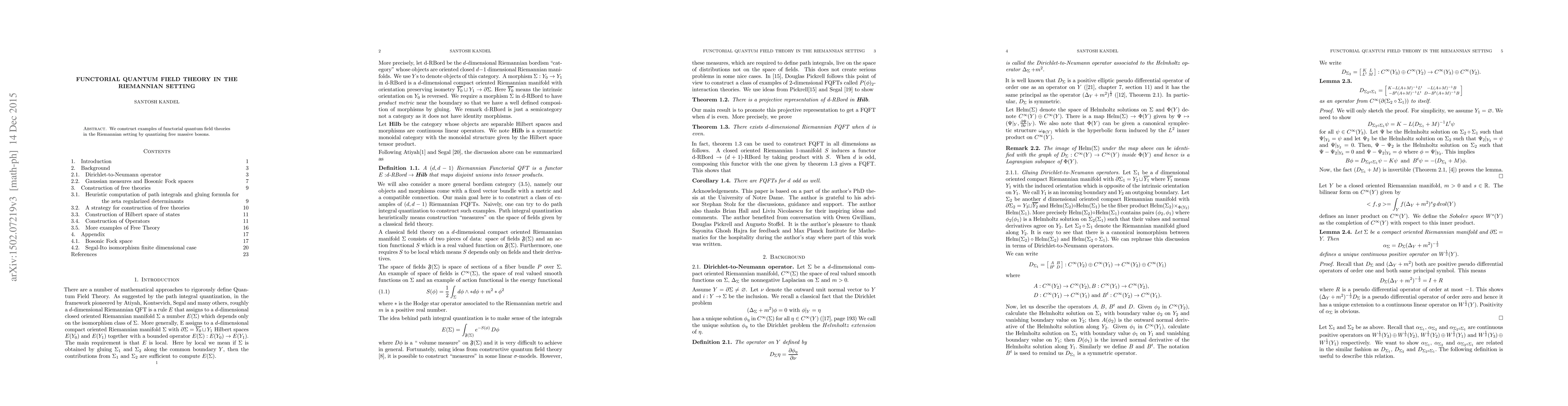 This paper constructs Functorial Quantum Field Theories in a Riemannian setting by quantizing free massive bosons, providing examples of how these theories can be realized. The work lays the groundwork for understanding quantum field theory in curved spacetime.