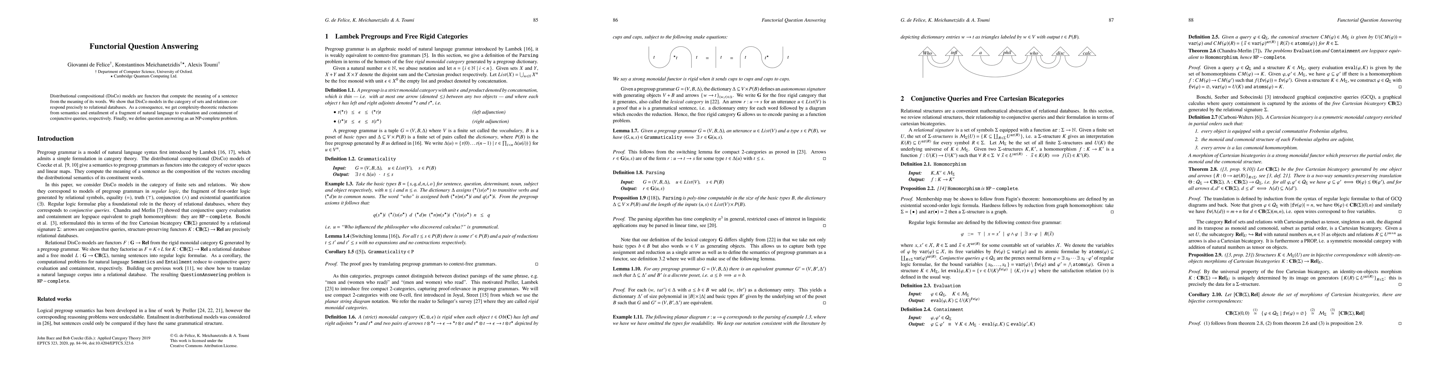 The paper demonstrates that Distributional compositional (DisCo) models, used for understanding sentence meaning from words, align with relational databases in set and relation category. This leads to complexity-theoretic connections between natural language semantics/entailment and conjunctive query evaluation/containment. The research also formally defines question answering as an NP-complete problem.