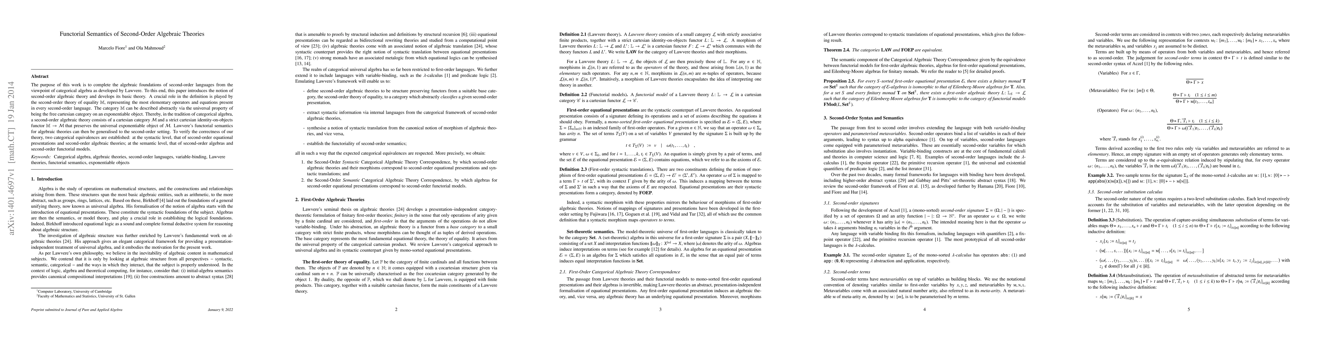 The purpose of this work is to complete the algebraic foundations of second-order languages from the viewpoint of categorical algebra as developed by Lawvere. To this end, this paper introduces the notion of second-order algebraic theory and develops its basic theory. A crucial role in the definition is played by the second-order theory of equality $\M$, representing the most elementary operators and equations present in every second-order language. The category $\M$ can be described abstractly via the universal property of being the free cartesian category on an exponentiable object. Thereby, in the tradition of categorical algebra, a second-order algebraic theory consists of a cartesian category $\Mlaw$ and a strict cartesian identity-on-objects functor $\M \to \Mlaw$ that preserves the universal exponentiable object of $\Mlaw$. Lawvere's functorial semantics for algebraic theories can then be generalised to the second-order setting. To verify the correctness of our theory, two categorical equivalences are established: at the syntactic level, that of second-order equational presentations and second-order algebraic theories; at the semantic level, that of second-order algebras and second-order functorial models.