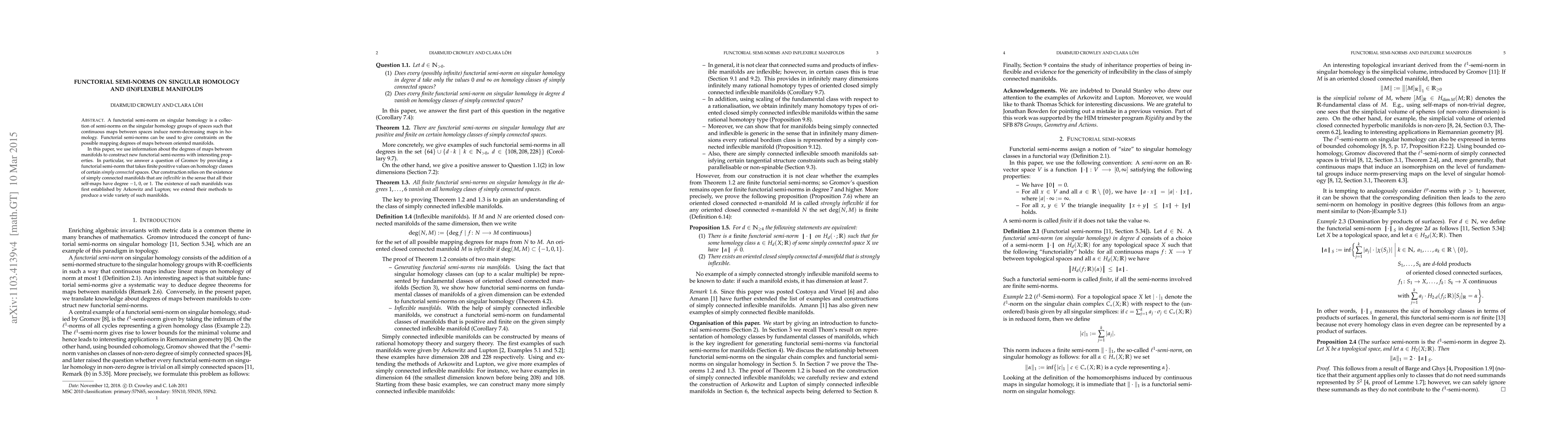 The paper introduces a novel method for constructing functorial semi-norms on singular homology, leveraging the properties of inflexible manifolds to provide concrete examples and answer a question posed by Gromov.