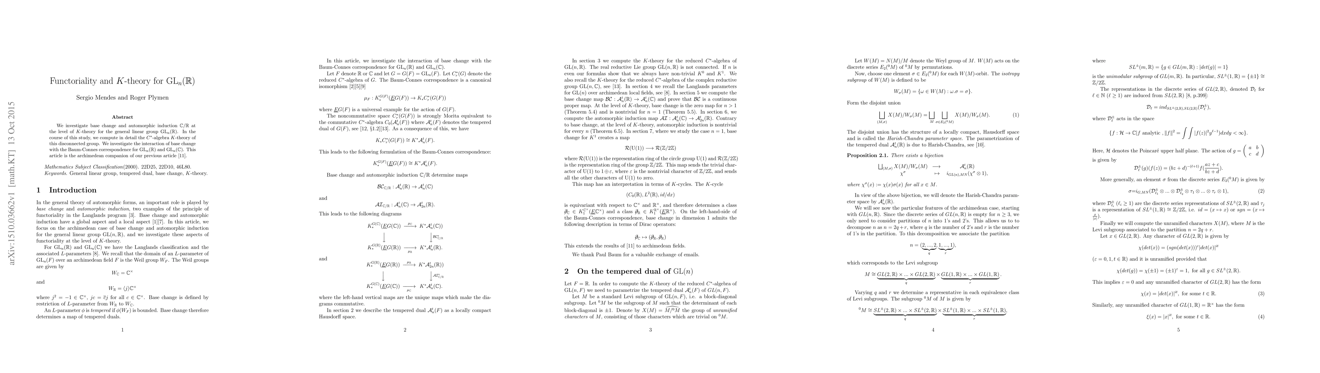 This paper explores the interplay between base change and automorphic induction in the context of K-theory for $GL_n(\mathbb{R})$, computing the C*-algebra K-theory of this group. It also examines the relationship between base change and the Baum-Connes correspondence for $GL_n(\mathbb{R})$ and $GL_n(\mathbb{C})$.