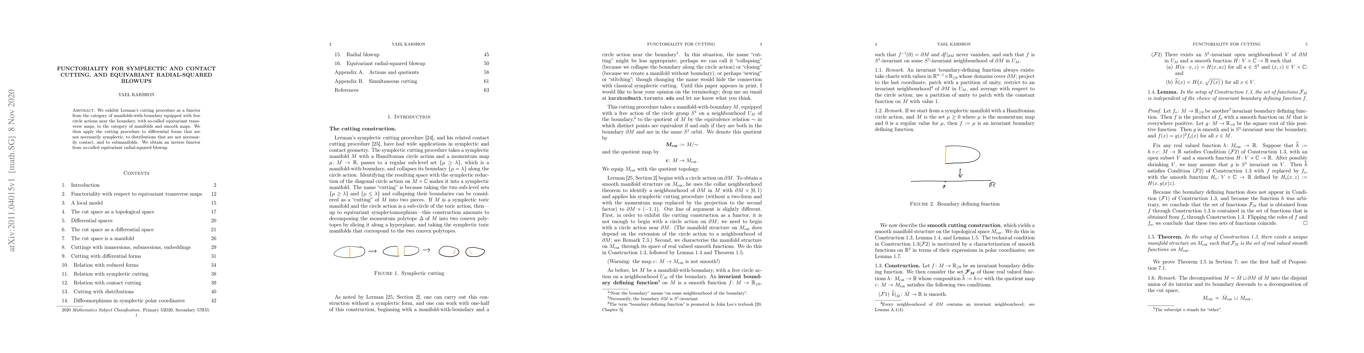 We exhibit Lerman's cutting procedure as a functor from the category of manifolds-with-boundary equipped with free circle actions near the boundary, with so-called equivariant transverse maps, to the category of manifolds and smooth maps. We then apply the cutting procedure to differential forms that are not necessarily symplectic, to distributions that are not necessarily contact, and to submanifolds. We obtain an inverse functor from so-called equivariant radial-squared blowup.