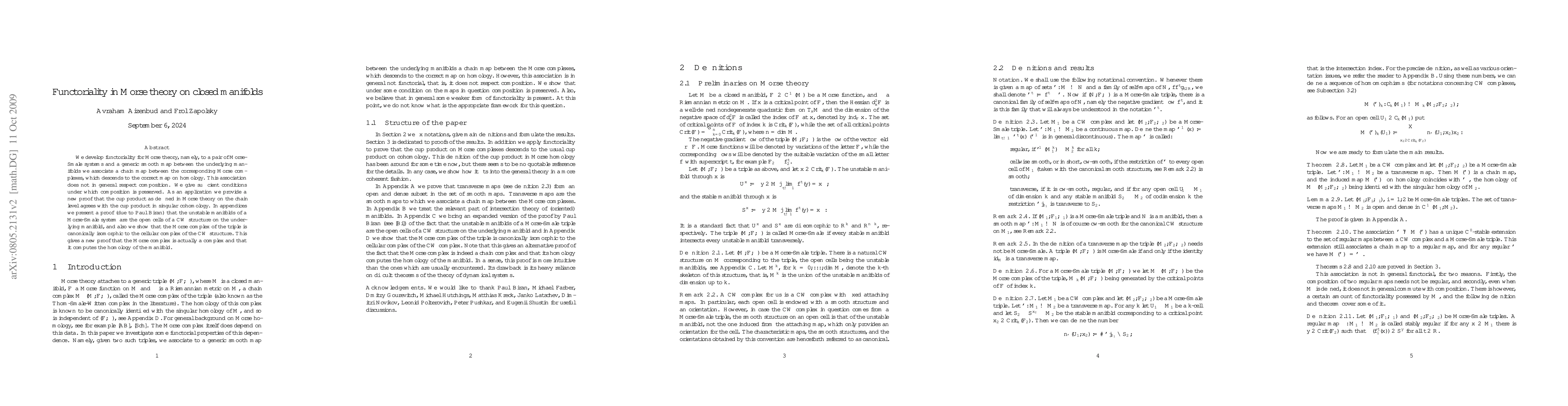 We develop functoriality for Morse theory, namely, to a pair of Morse-Smale systems and a generic smooth map between the underlying manifolds we associate a chain map between the corresponding Morse complexes, which descends to the correct map on homology. This association does not in general respect composition. We give sufficient conditions under which composition is preserved. As an application we provide a new proof that the cup product as defined in Morse theory on the chain level agrees with the cup product in singular cohomology. In appendices we present a proof (due to Paul Biran) that the unstable manifolds of a Morse-Smale system are the open cells of a CW structure on the underlying manifold, and also we show that the Morse complex of the triple is canonically isomorphic to the cellular complex of the CW structure. This gives a new proof that the Morse complex is actually a complex and that it computes the homology of the manifold.
