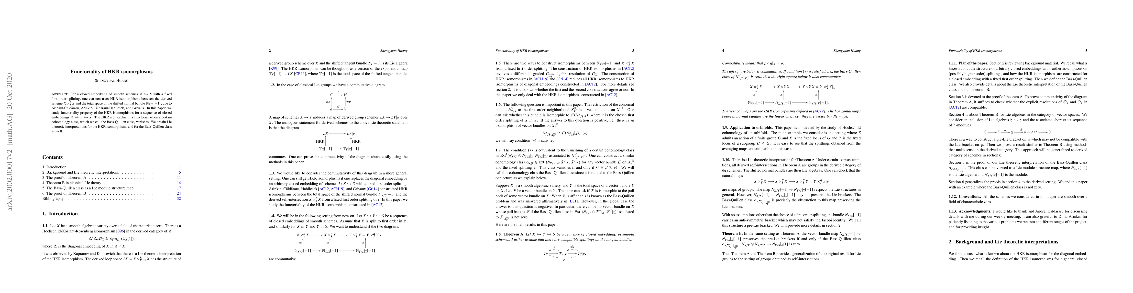 For a closed embedding of smooth schemes $X\hookrightarrow S$ with a fixed first order splitting, one can construct HKR isomorphisms between the derived scheme $X\times^R_S X$ and the total space of the shifted normal bundle $\mathbb{N}_{X/S}[-1]$, due to Arinkin-C\u{a}ld\u{a}raru, Arinkin-C\u{a}ld\u{a}raru-Hablicsek, and Grivaux. In this paper, we study functoriality property of the HKR isomorphisms for a sequence of closed embeddings $X\hookrightarrow Y\hookrightarrow S$. The HKR isomorphism is functorial when a certain cohomology class, which we call the Bass-Quillen class, vanishes. We obtain Lie theoretic interpretations for the HKR isomorphisms and for the Bass-Quillen class as well.