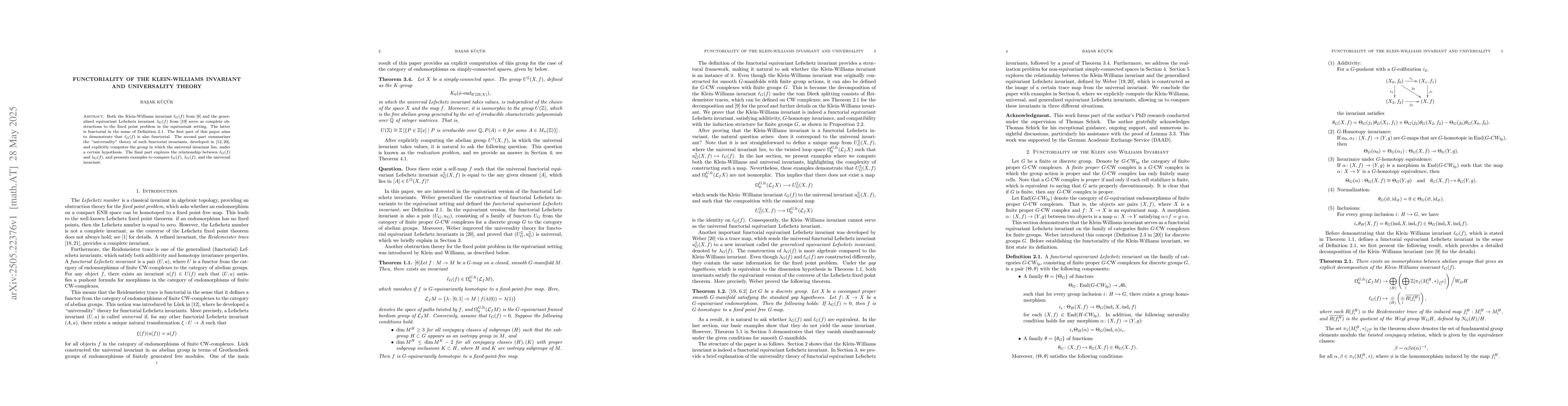 The paper aims to prove the functoriality of the Klein-Williams invariant $\ell_G(f)$, summarizes the universality theory of functorial invariants, and explores the relationship between $\ell_G(f)$ and $\lambda_G(f)$ through examples.