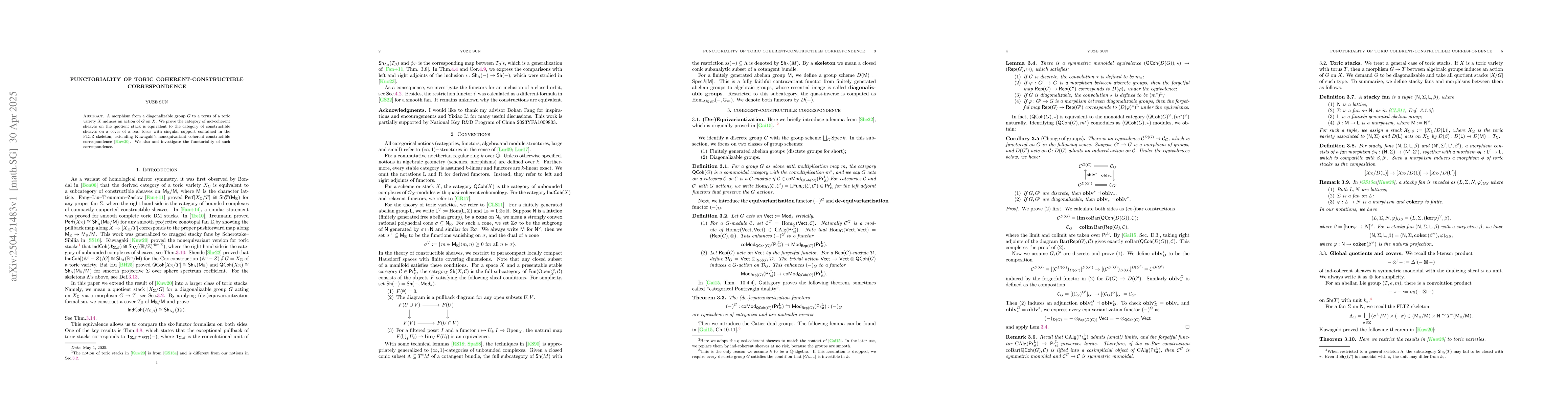 This paper proves an equivalence between the category of ind-coherent sheaves on the quotient stack induced by a diagonalizable group's action on a toric variety and constructible sheaves on a real torus cover with specific singular support. It extends Kuwagaki's nonequivariant correspondence and investigates the functoriality of this relationship.