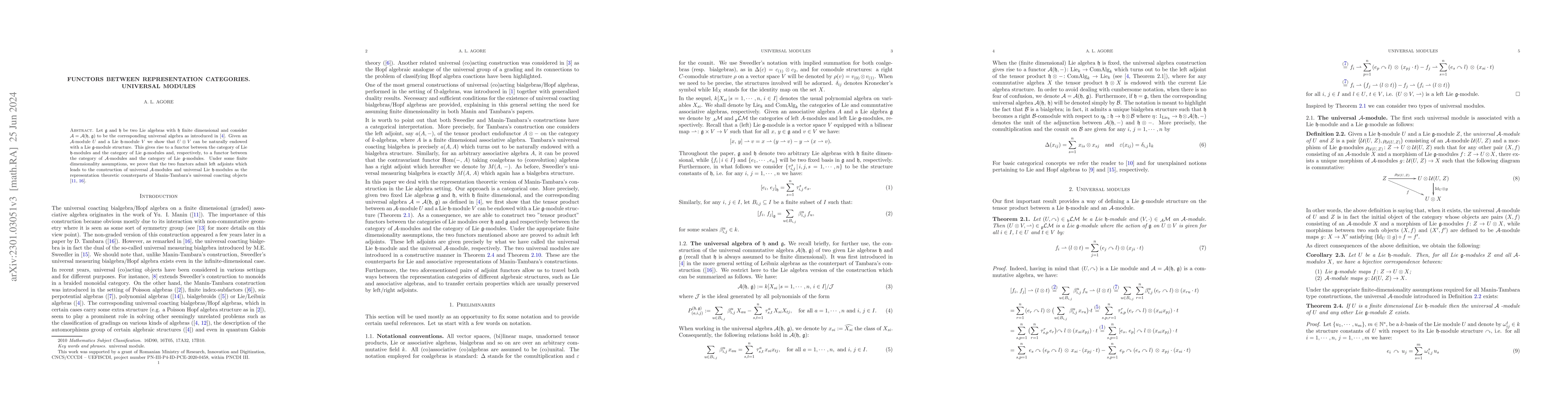 This paper studies functors between representation categories of Lie algebras $\mathfrak{g}$ and $\mathfrak{h}$, demonstrating that an ${\mathcal A}$-module tensored with a $\mathfrak{h}$-module naturally becomes a $\mathfrak{g}$-module, establishing adjoint functors under finite dimensionality conditions, and constructing universal modules akin to Manin-Tambara objects.