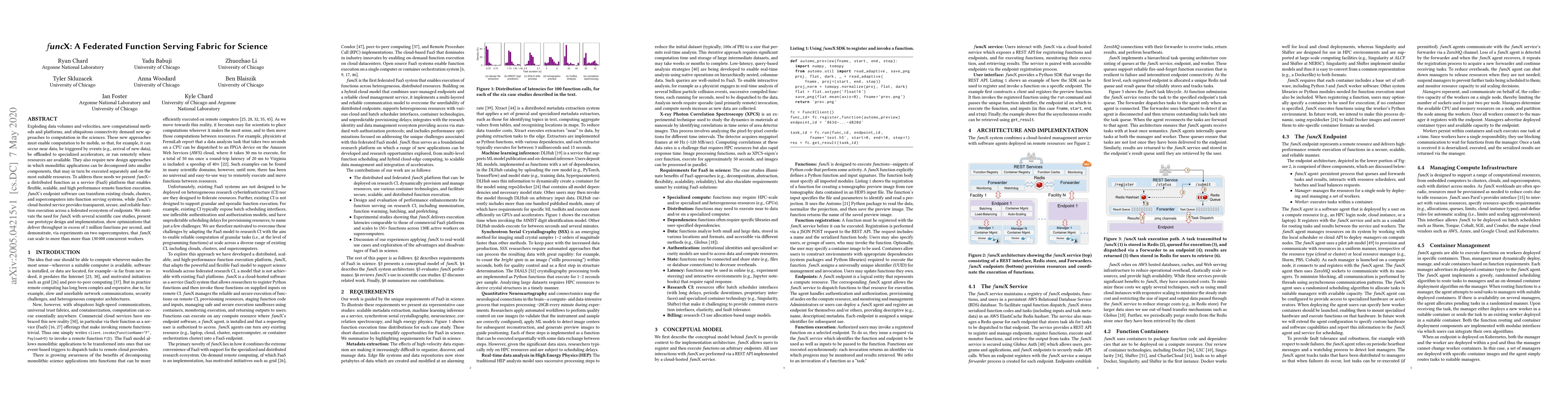 funcX is a distributed function as a service platform that enables flexible, scalable, and high-performance remote function execution for scientific applications. It demonstrates the ability to scale to over 130,000 concurrent workers on two supercomputers.