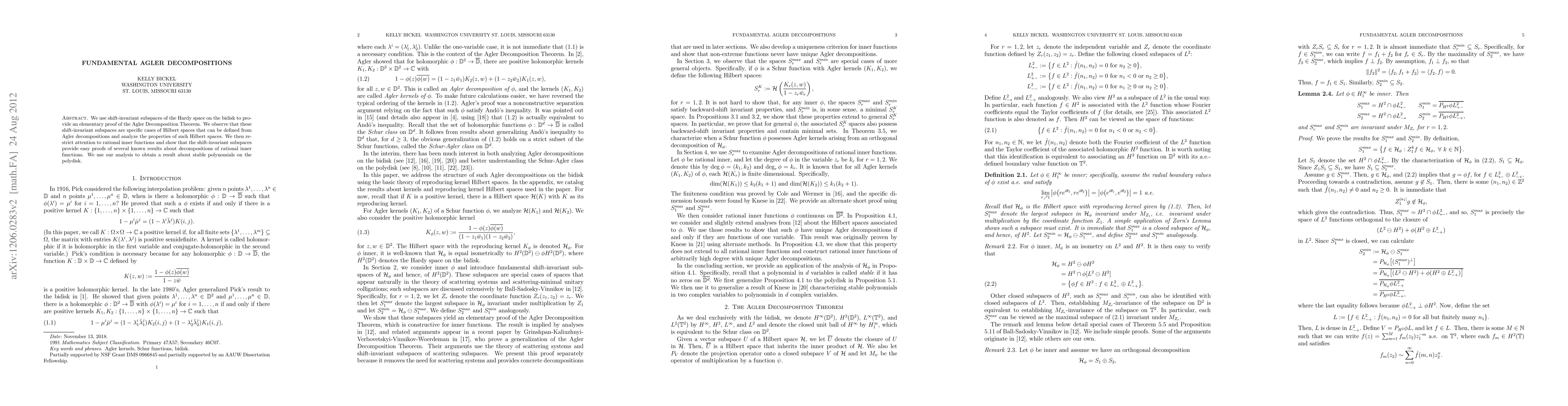 We use shift-invariant subspaces of the Hardy space on the bidisk to provide an elementary proof of the Agler Decomposition Theorem. We observe that these shift-invariant subspaces are specific cases of Hilbert spaces that can be defined from Agler decompositions and analyze the properties of such Hilbert spaces. We then restrict attention to rational inner functions and show that the shift-invariant subspaces provide easy proofs of several known results about decompositions of rational inner functions. We use our analysis to obtain a result about stable polynomials on the polydisk.