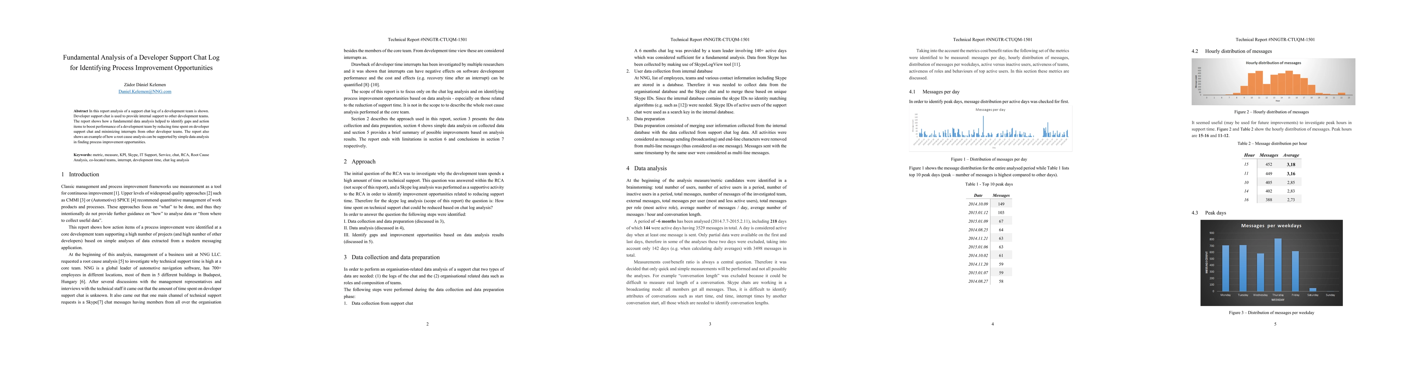 In this report analysis of a support chat log of a development team is shown. Developer support chat is used to provide internal support to other development teams. The report shows how a fundamental data analysis helped to identify gaps and action items to boost performance of a development team by reducing time spent on developer support chat and minimizing interrupts from other developer teams. The report also shows an example of how a root cause analysis can be supported by simple data analysis in finding process improvement opportunities.