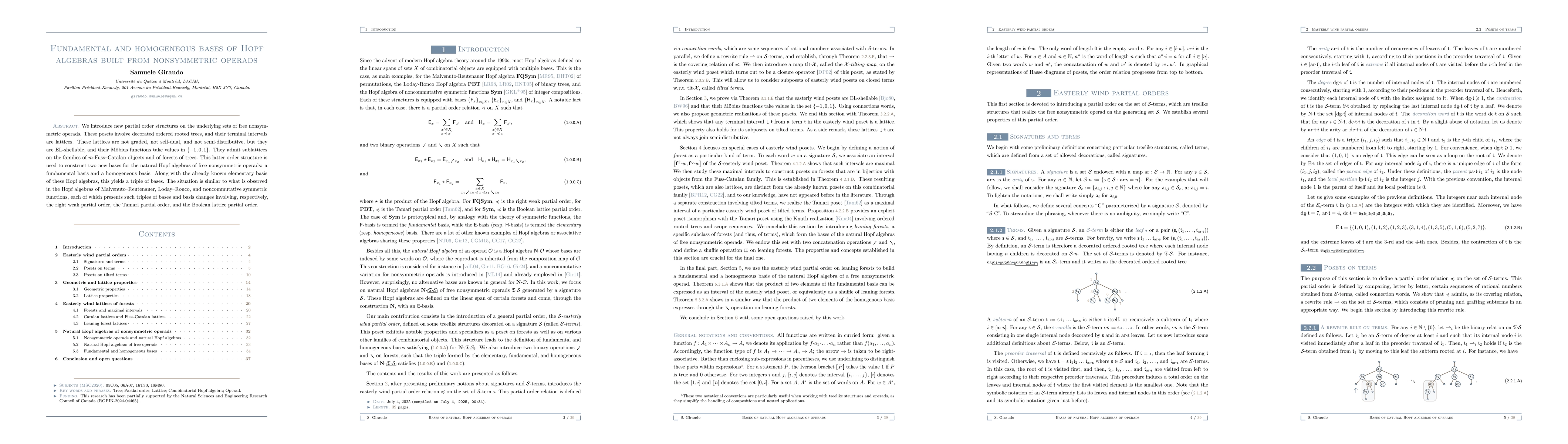 We introduce new partial order structures on the underlying sets of free nonsymmetric operads. These posets involve decorated ordered rooted trees, and their terminal intervals are lattices. These lattices are not graded, not self-dual, and not semi-distributive, but they are EL-shellable, and their M\"bius functions take values in $\{-1, 0, 1\}$. They admit sublattices on the families of $m$-Fuss-Catalan objects and of forests of trees. This latter order structure is used to construct two new bases for the natural Hopf algebras of free nonsymmetric operads: a fundamental basis and a homogeneous basis. Along with the already known elementary basis of these Hopf algebras, this yields a triple of bases. The situation is similar to what is observed in the Hopf algebras of Malvenuto-Reutenauer, Loday-Ronco, and noncommutative symmetric functions, each of which presents such triples of bases and basis changes involving, respectively, the right weak partial order, the Tamari partial order, and the Boolean lattice partial order.
