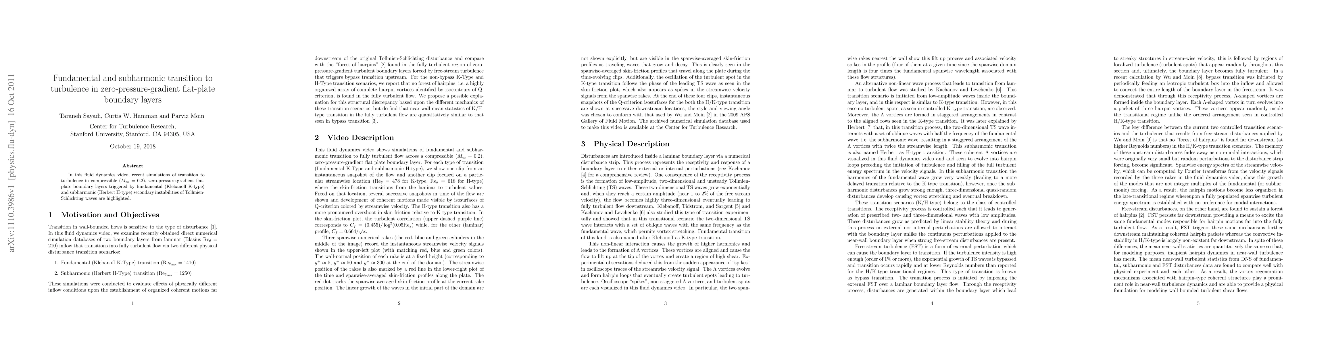 In this fluid dynamics video, recent simulations of transition to turbulence in compressible (M = 0.2), zero-pressure-gradient flat-plate boundary layers triggered by fundamental (Klebanoff K-type) and subharmonic (Herbert H-type) secondary instabilities of Tollmien-Schlichting waves are highlighted.