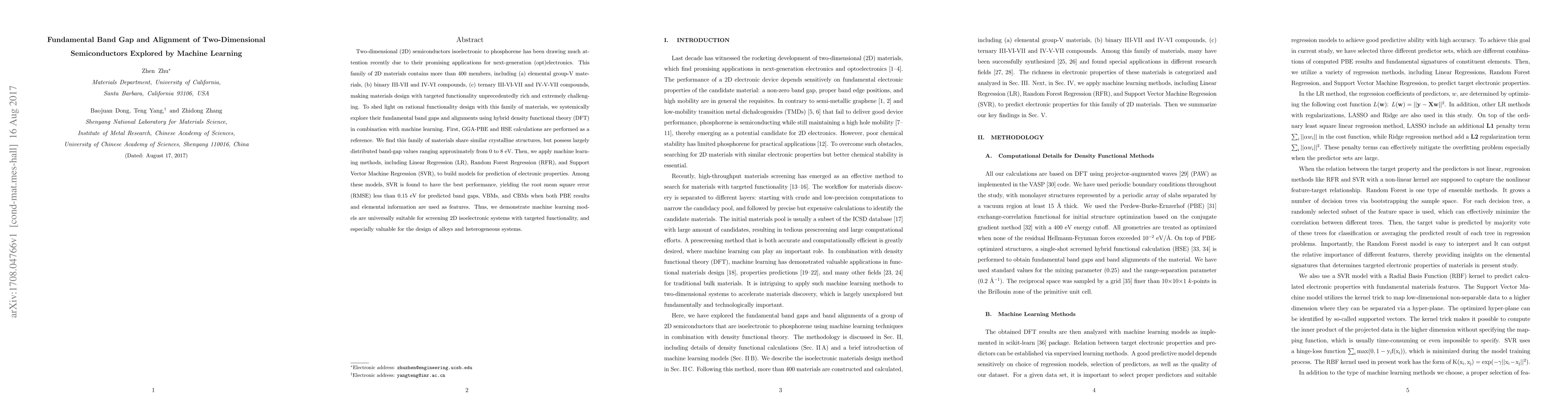 This paper explores the fundamental band gaps and alignments of over 400 two-dimensional (2D) semiconductor materials using hybrid density functional theory and machine learning. Support Vector Machine Regression (SVR) emerges as the most effective model, achieving an RMSE of less than 0.15 eV for predicting electronic properties, demonstrating the potential of machine learning in designing 2D isoelectronic systems.