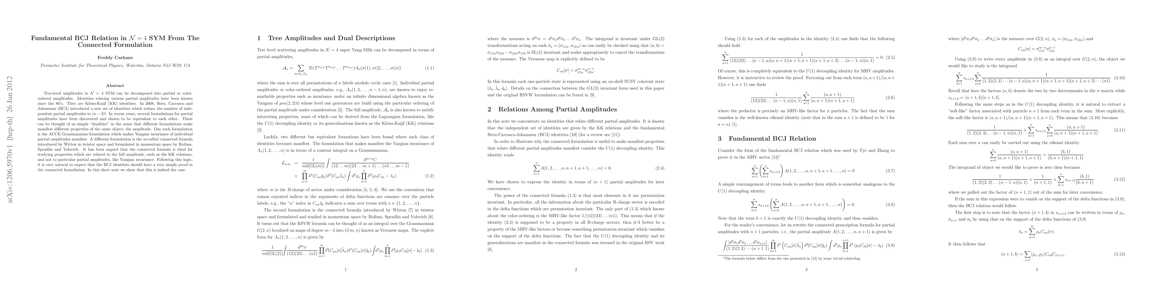 Tree-level amplitudes in N=4 SYM can be decomposed into partial or color-ordered amplitudes. Identities relating various partial amplitudes have been known since the 80's. They are Kleiss-Kuijf (KK) identities. In 2008, Bern, Carrasco and Johansson (BCJ) introduced a new set of identities which reduce the number of independent partial amplitudes to (n-3)!. In recent years, several formulations for partial amplitudes have been discovered and shown to be equivalent to each other. These can be thought of as simple dualities in the sense that different formulations make manifest different properties of the same object; the amplitude. One such formulation is the ACCK Grassmannian formulation which makes Yangian invariance of individual partial amplitudes manifest. A different formulation is the so-called connected formula introduced by Witten in twistor space and formulated in momentum space by Roiban, Spradlin and Volovich. It has been argued that the connected formula is ideal for studying properties which are related to the full amplitude, such as the KK relations, and not to particular partial amplitudes, like Yangian invariance. Following this logic, it is very natural to expect that the BCJ identities should have a very simple proof in the connected formulation. In this short note we show that this is indeed the case.