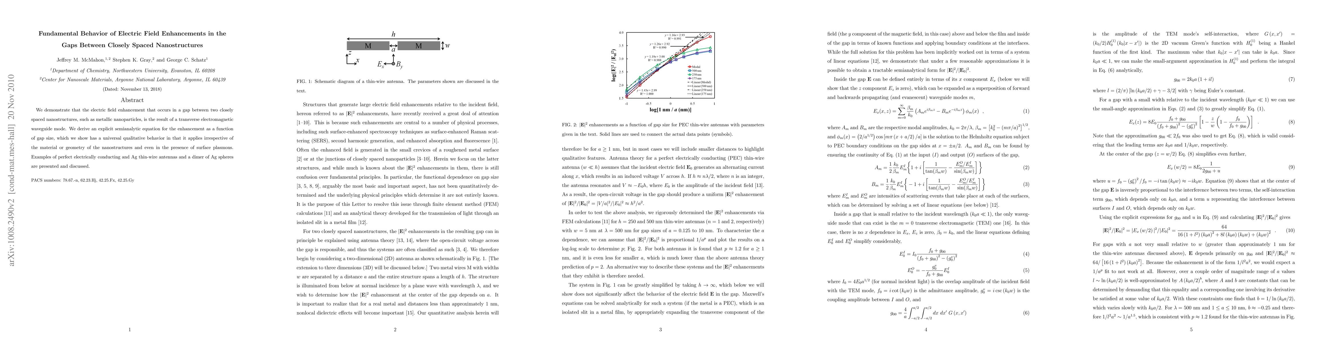 This paper demonstrates that electric field enhancements in gaps between closely spaced nanostructures arise from transverse electromagnetic waveguide modes. It provides a universal semianalytic equation for these enhancements, applicable across various materials and geometries, even with surface plasmons.