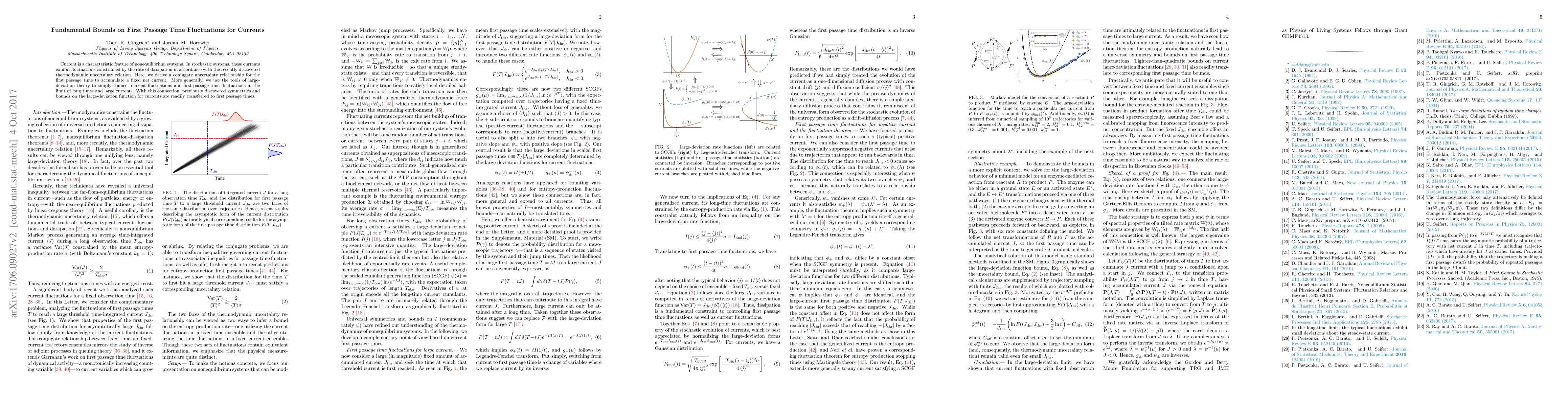 This paper explores the fundamental bounds on fluctuations in first passage times for currents in nonequilibrium systems, deriving a conjugate uncertainty relationship. It leverages large-deviation theory to link current fluctuations with first passage time fluctuations, transferring previously known symmetries and bounds to the latter.