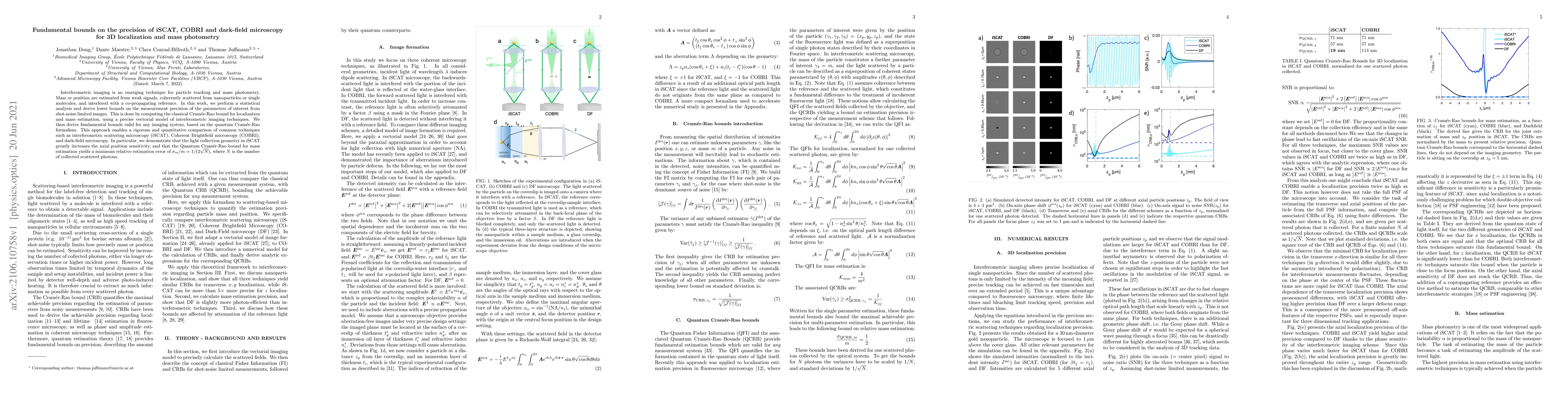 This paper statistically analyzes interferometric imaging techniques like iSCAT, COBRI, and dark-field microscopy to derive fundamental bounds on their precision for 3D localization and mass photometry. It establishes classical and quantum Cramér-Rao bounds, showing that iSCAT's light collection geometry enhances axial sensitivity and that mass estimation has a minimum relative error of $\sigma_m/m=1/(2\sqrt{N})$.