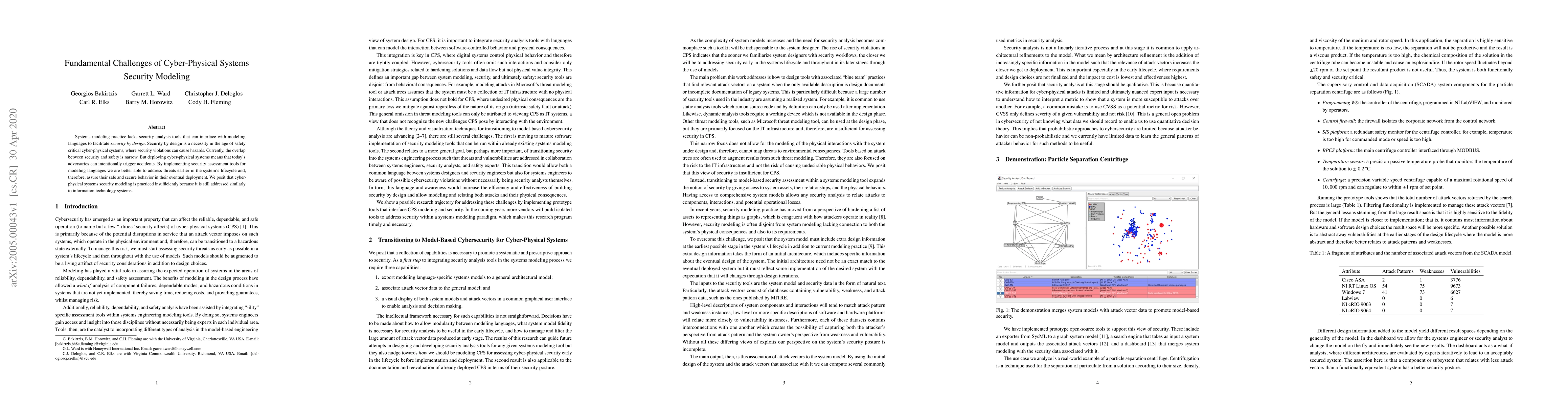 This paper discusses the lack of security analysis tools in systems modeling that can integrate with modeling languages to enable security by design. It argues that current practices insufficiently address the unique challenges of cyber-physical systems, which require more robust security assessments to prevent intentional hazards and ensure safety in deployment.