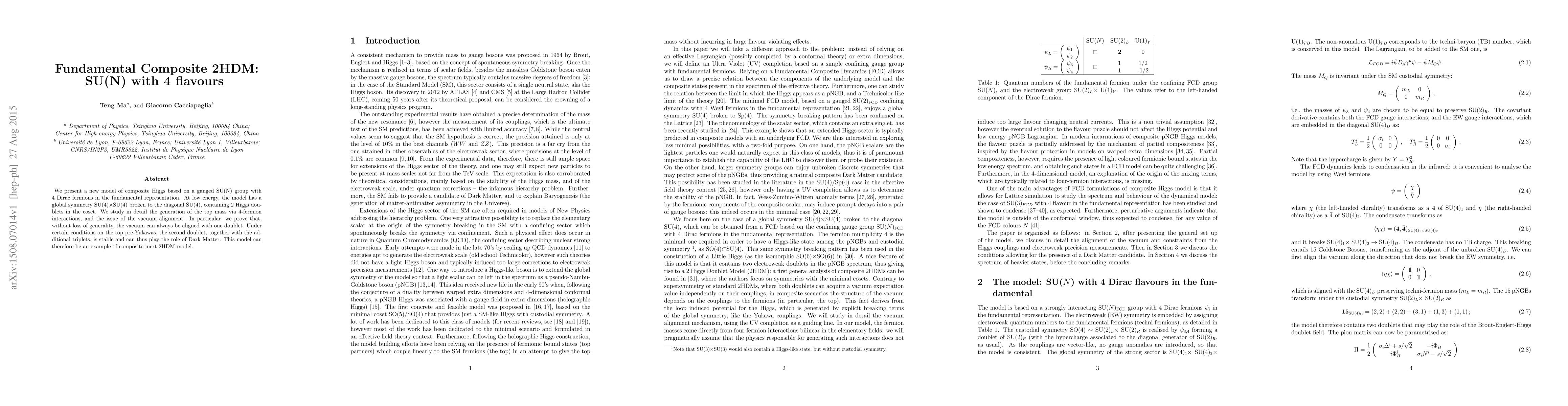 We present a new model of composite Higgs based on a gauged SU(N) group with 4 Dirac fermions in the fundamental representation. At low energy, the model has a global symmetry SU(4)$\times$SU(4) broken to the diagonal SU(4), containing 2 Higgs doublets in the coset. We study in detail the generation of the top mass via 4-fermion interactions, and the issue of the vacuum alignment. In particular, we prove that, without loss of generality, the vacuum can always be aligned with one doublet. Under certain conditions on the top pre-Yukawas, the second doublet, together with the additional triplets, is stable and can thus play the role of Dark Matter. This model can therefore be an example of composite inert-2HDM model.