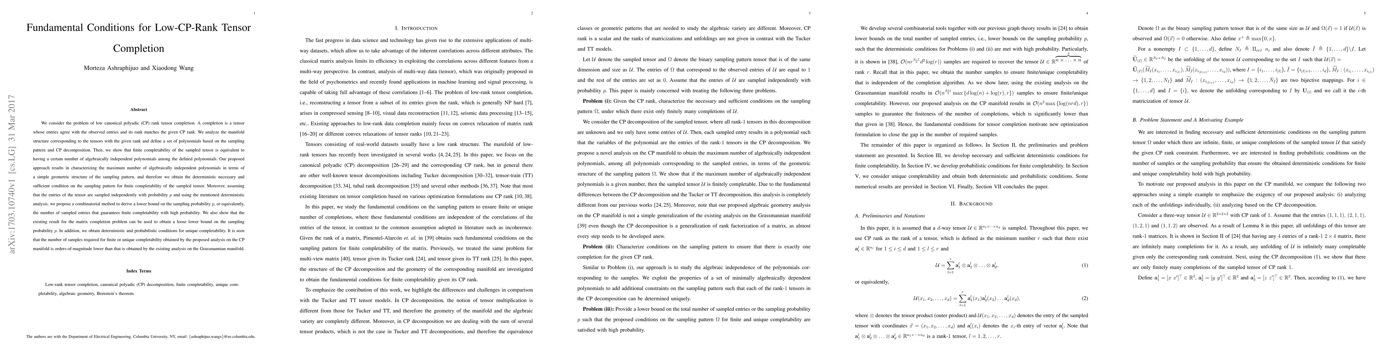 This paper investigates the completion of low canonical polyadic (CP) rank tensors, establishing conditions for their finite completability based on a geometric structure of the sampling pattern. It derives deterministic necessary and sufficient conditions for tensor completion and provides a probabilistic analysis to estimate the sampling probability ensuring completion with high probability, showing significantly lower sample requirements compared to existing methods.