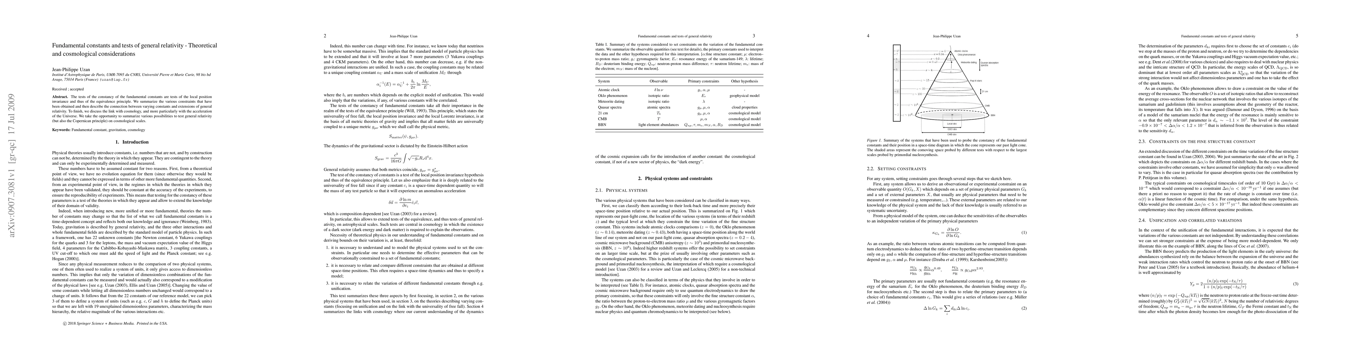 This paper reviews tests of the constancy of fundamental constants, linking them to local position invariance and the equivalence principle, and discusses how varying constants may suggest extensions of general relativity. It also explores the cosmological implications, particularly the acceleration of the universe, and summarizes methods to test general relativity on cosmological scales.