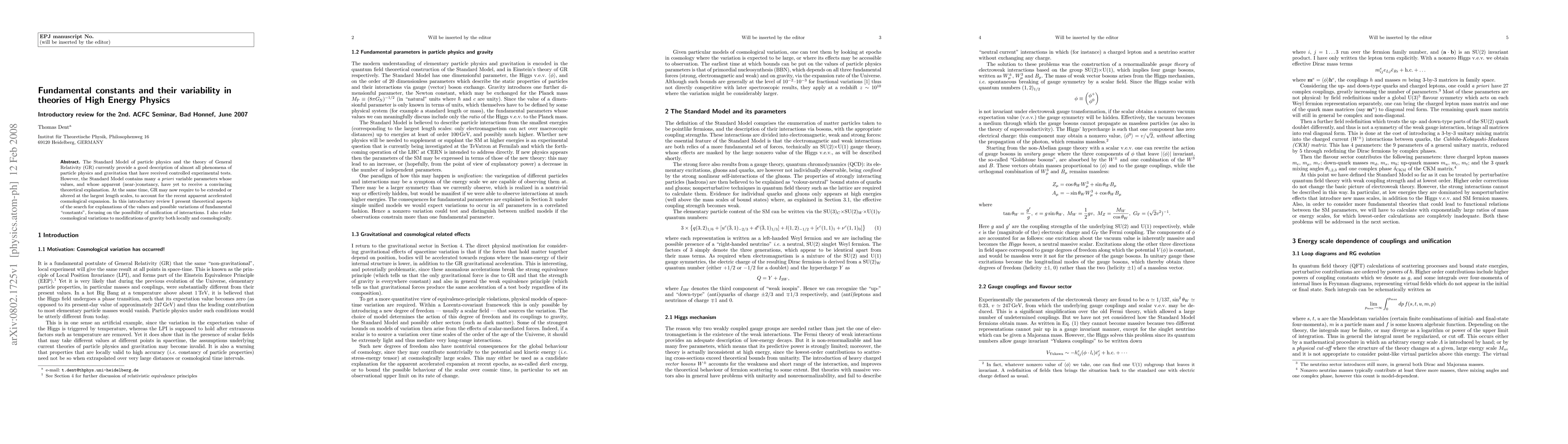 This paper reviews theoretical approaches to explaining the values and potential variability of fundamental constants in particle physics and General Relativity, emphasizing the quest for unification of interactions and modifications of gravity to account for the accelerated cosmological expansion.