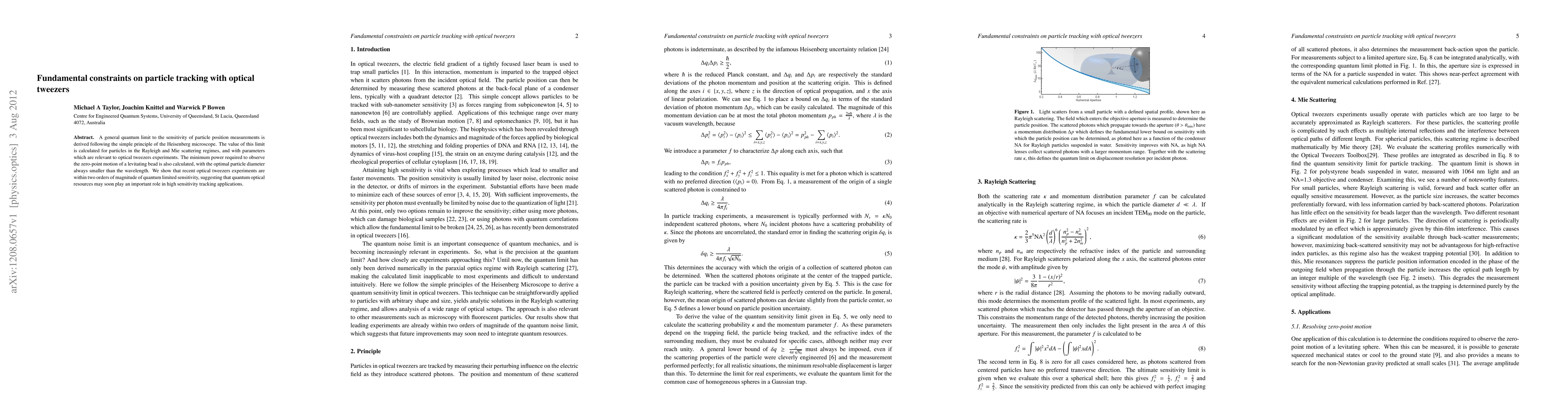 This paper derives a quantum limit to the sensitivity of particle position measurements using optical tweezers, showing that recent experiments are close to this limit. It calculates the minimum power needed to observe zero-point motion, indicating that quantum optical resources may soon enhance high-sensitivity tracking.