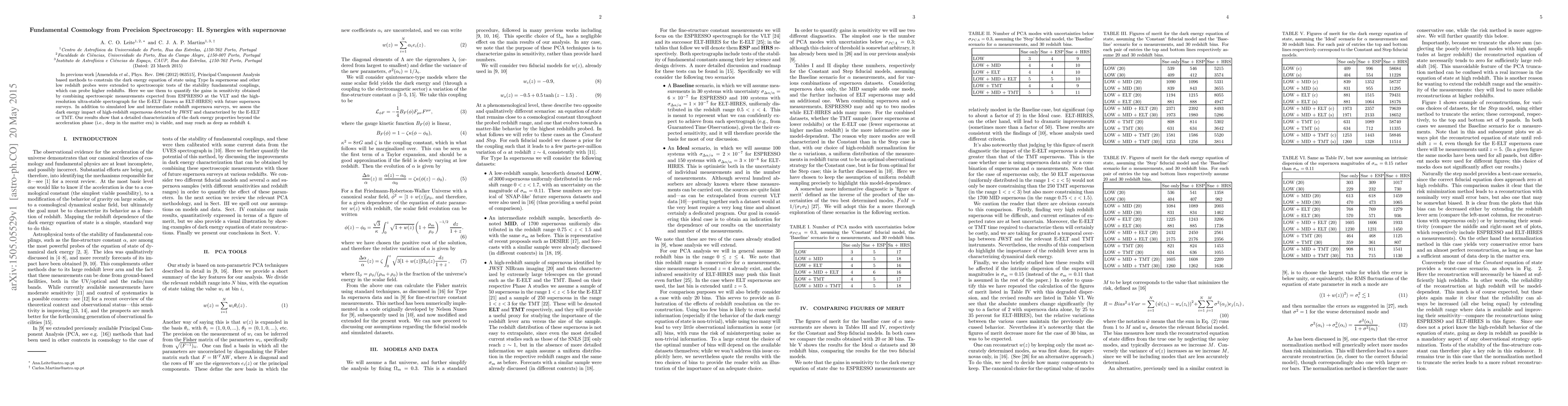 In previous work [Amendola {\it et al.}, Phys. Rev. D86 (2012) 063515], Principal Component Analysis based methods to constrain the dark energy equation of state using Type Ia supernovae and other low redshift probes were extended to spectroscopic tests of the stability fundamental couplings, which can probe higher redshifts. Here we use them to quantify the gains in sensitivity obtained by combining spectroscopic measurements expected from ESPRESSO at the VLT and the high-resolution ultra-stable spectrograph for the E-ELT (known as ELT-HIRES) with future supernova surveys. In addition to simulated low and intermediate redshift supernova surveys, we assess the dark energy impact of high-redshift supernovas detected by JWST and characterized by the E-ELT or TMT. Our results show that a detailed characterization of the dark energy properties beyond the acceleration phase (i.e., deep in the matter era) is viable, and may reach as deep as redshift 4.
