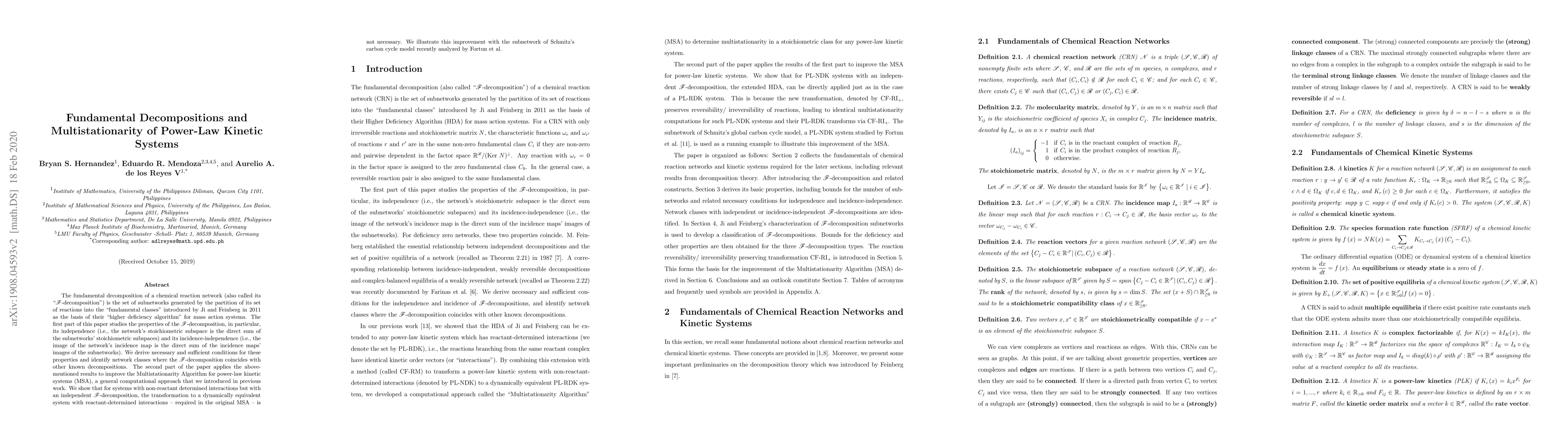 The fundamental decomposition of a chemical reaction network (also called its "$\mathscr{F}$-decomposition") is the set of subnetworks generated by the partition of its set of reactions into the "fundamental classes" introduced by Ji and Feinberg in 2011 as the basis of their "higher deficiency algorithm" for mass action systems. The first part of this paper studies the properties of the $\mathscr{F}$-decomposition, in particular, its independence (i.e., the network's stoichiometric subspace is the direct sum of the subnetworks' stoichiometric subspaces) and its incidence-independence (i.e., the image of the network's incidence map is the direct sum of the incidence maps' images of the subnetworks). We derive necessary and sufficient conditions for these properties and identify network classes where the $\mathscr{F}$-decomposition coincides with other known decompositions. The second part of the paper applies the above-mentioned results to improve the Multistationarity Algorithm for power-law kinetic systems (MSA), a general computational approach that we introduced in previous work. We show that for systems with non-reactant determined interactions but with an independent $\mathscr{F}$-decomposition, the transformation to a dynamically equivalent system with reactant-determined interactions -- required in the original MSA -- is not necessary. We illustrate this improvement with the subnetwork of Schmitz's carbon cycle model recently analyzed by Fortun et al.