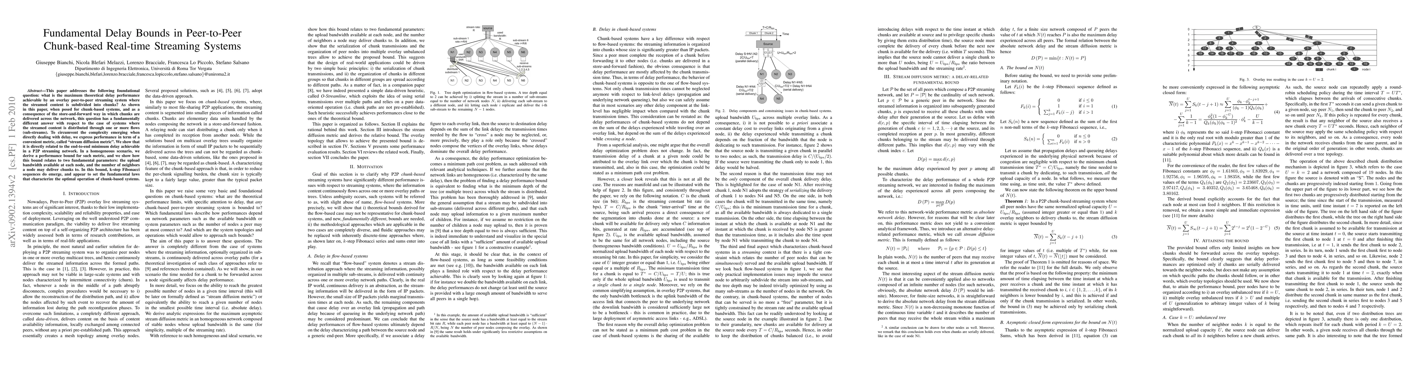 This paper sets a fundamental delay bound for peer-to-peer chunk-based real-time streaming systems, showing that it depends on upload bandwidth and the number of neighbors a node can deliver chunks to.