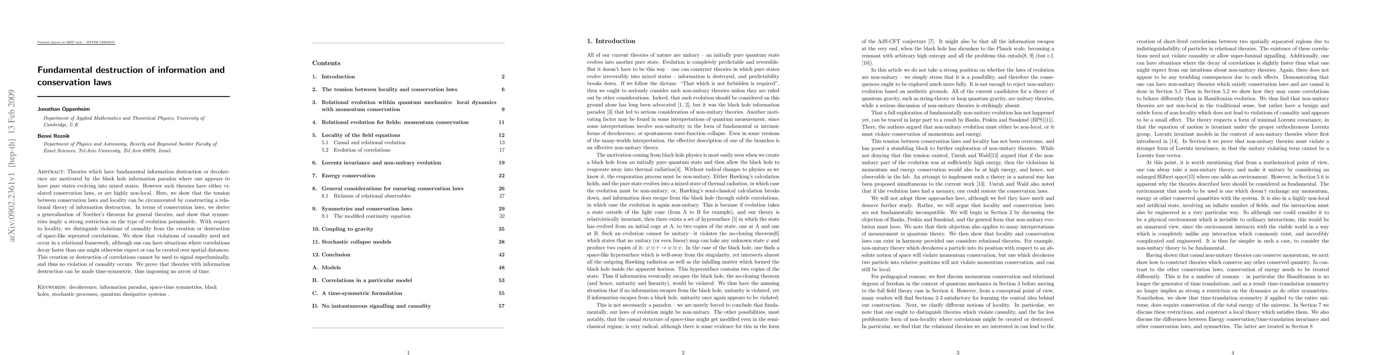 This paper proposes a relational theory to address the black hole information paradox, demonstrating that information destruction can be consistent with conservation laws and locality. It generalizes Noether's theorem and shows that while correlations can decay or be created over distances, these processes do not violate causality or introduce an arrow of time.