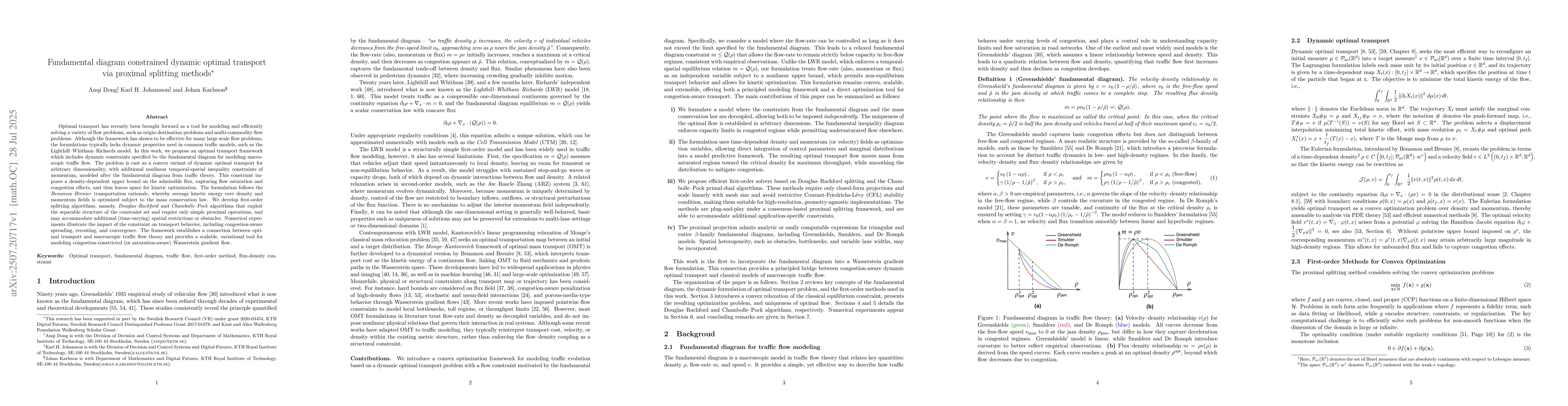 Optimal transport has recently been brought forward as a tool for modeling and efficiently solving a variety of flow problems, such as origin-destination problems and multi-commodity flow problems. Although the framework has shown to be effective for many large scale flow problems, the formulations typically lack dynamic properties used in common traffic models, such as the Lighthill-Whitham-Richards model. In this work, we propose an optimal transport framework that includes dynamic constraints specified by the fundamental diagram for modeling macroscopic traffic flow. The problem is cast as a convex variant of dynamic optimal transport, with additional nonlinear temporal-spatial inequality constraints of momentum, modeled after the fundamental diagram from traffic theory. This constraint imposes a density-dependent upper bound on the admissible flux, capturing flow saturation and congestion effects, and thus leaves space for kinetic optimization. The formulation follows the Benamou-Brenier transportation rationale, whereby kinetic energy over density and momentum fields is optimized subject to the mass conservation law. We develop proximal splitting methods, namely the Douglas-Rachford and Chambolle-Pock algorithms, which exploit the separable structure of the constraint set and require only simple proximal operations, and can accommodate additional (time-varying) spatial restrictions or obstacles. Numerical experiments illustrate the impact of the constraint on transport behavior, including congestion-aware spreading, rerouting, and convergence. The framework establishes a connection between optimal transport and macroscopic traffic flow theory and provides a scalable, variational tool for modeling congestion-constricted (or saturation-aware) Wasserstein gradient flow.