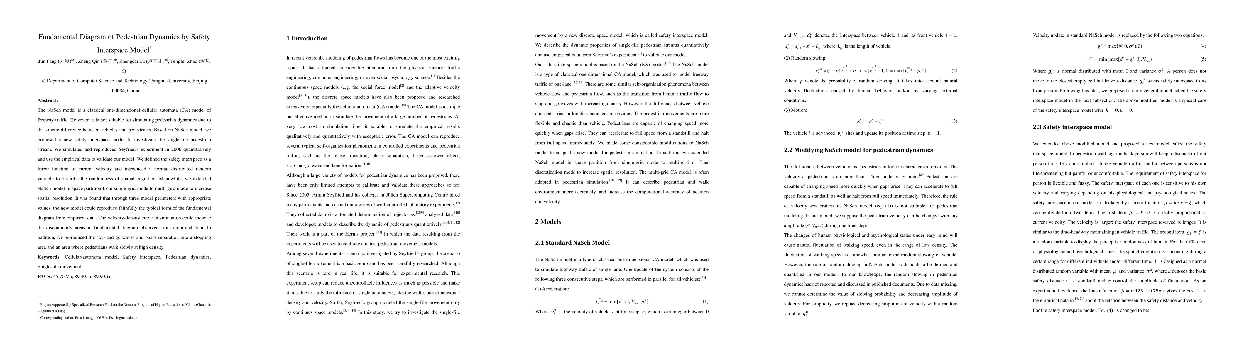 This paper proposes a new safety interspace model based on the NaSch model to simulate pedestrian dynamics, successfully reproducing Seyfried's 2006 experiment and capturing the fundamental diagram of pedestrian flow, including stop-and-go waves and phase separation. The model introduces a linear safety interspace function and a random variable to account for spatial cognition.